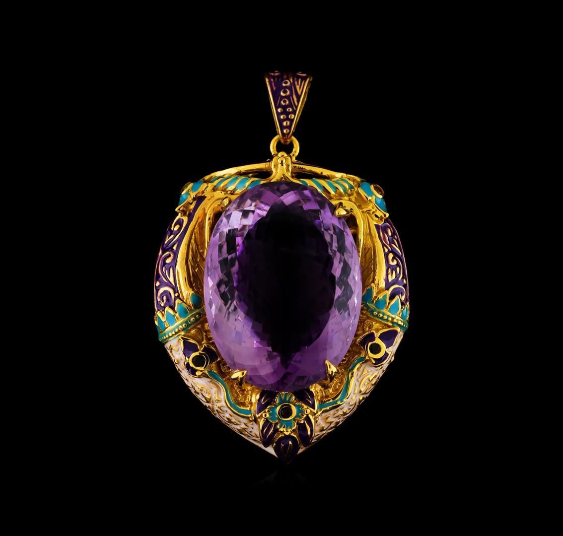 One of a kind high fashion sterling silver Pendant weighing 49.6 grams. Containing: Amethyst, Tourmaline, Violet Enamel Inlay, Turquoise Enamel Inlay. This sterling silver promises a lasting shine.