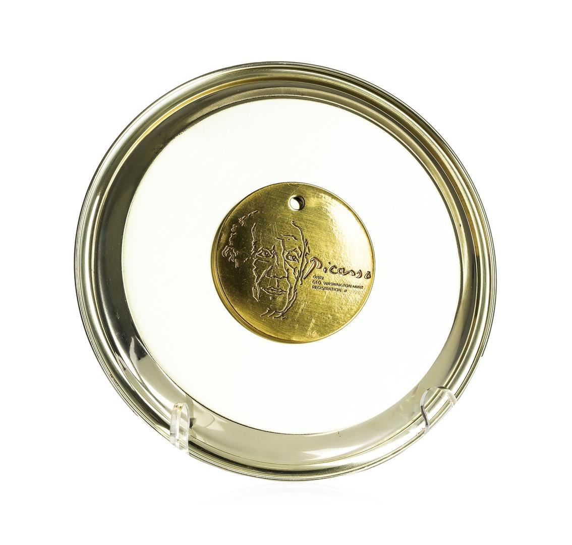 One sterling silver Picasso plate from the George Washington Mint, featuring Don Quixote La Mancha. Measures 8" wide.