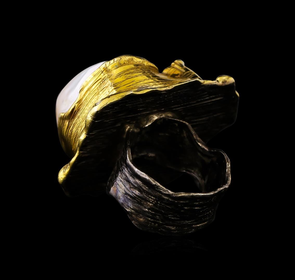 One of a kind high fashion sterling silver Ring weighing 25.5 grams. Black Antique texture. Containing: Freshwater Pearl, White Crystal. This sterling silver promises a lasting shine.