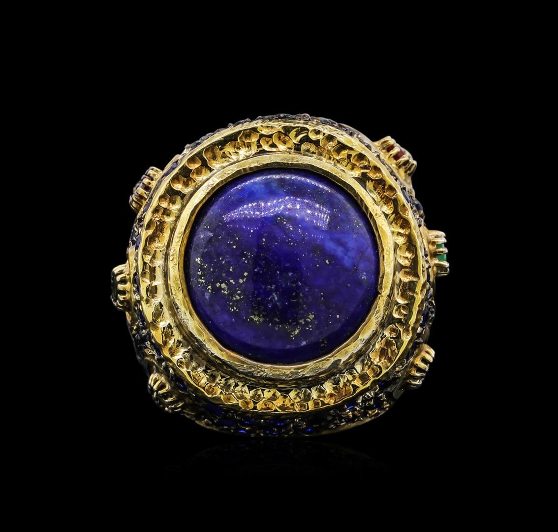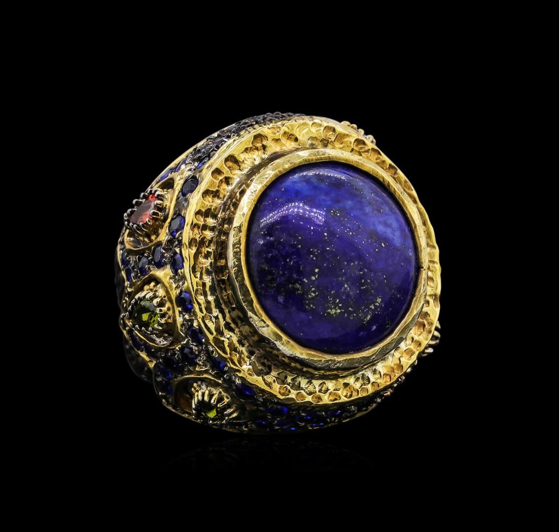 One of a kind high fashion sterling silver Ring weighing 25.3 grams. Black Antique texture. Containing: Lapis, Ruby, Blue Crystal, Multi-color Crystals. This sterling silver promises a lasting shine.