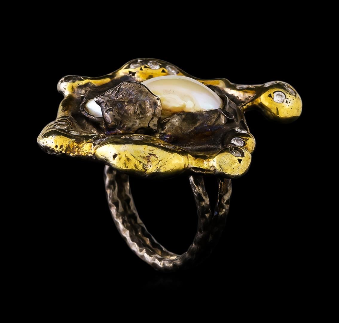 One of a kind high fashion sterling silver Ring weighing 16.6 grams. Black Antique texture. Containing: Freshwater Pearl, White Crystal. This sterling silver promises a lasting shine.