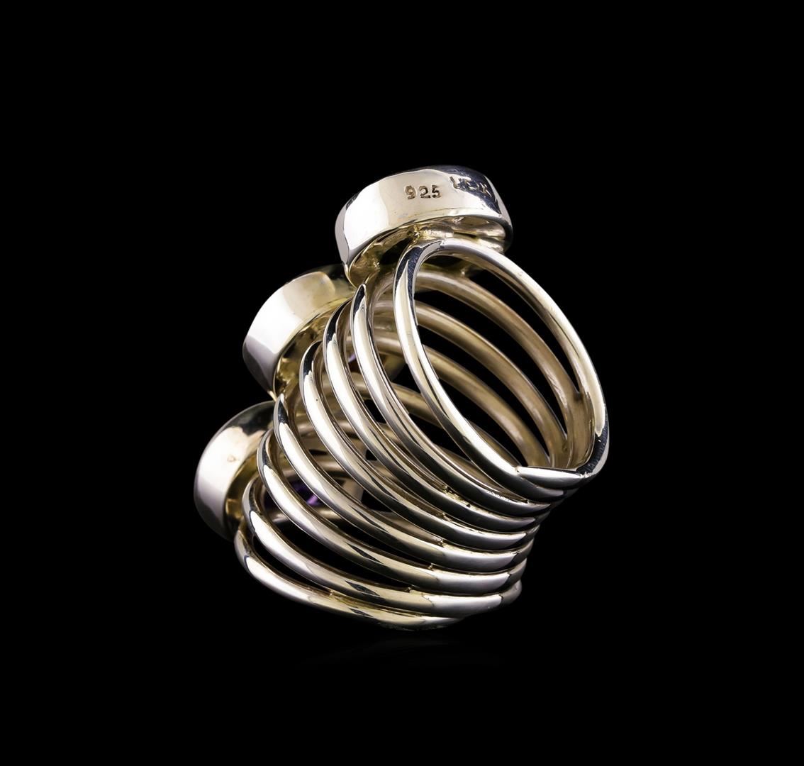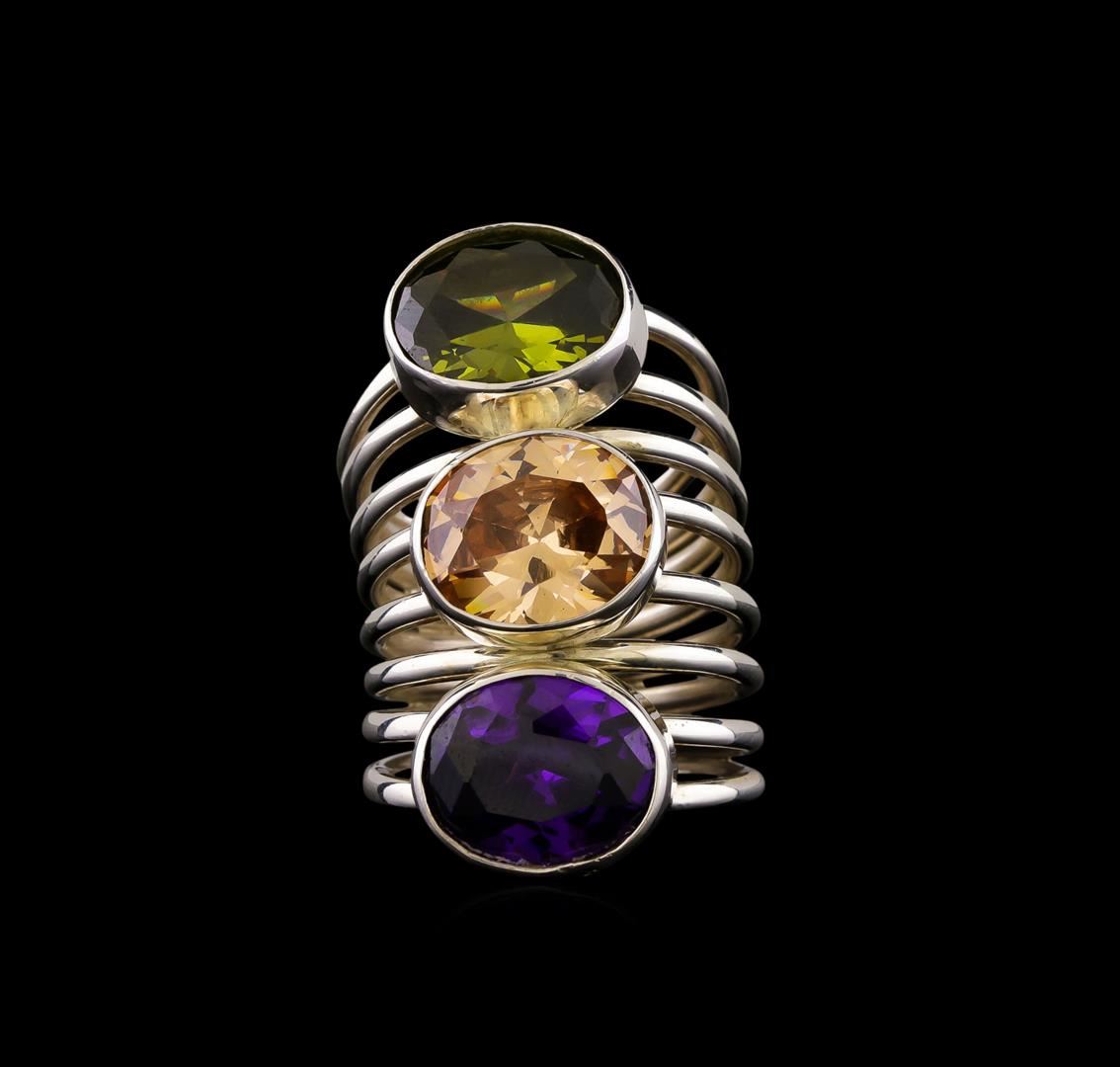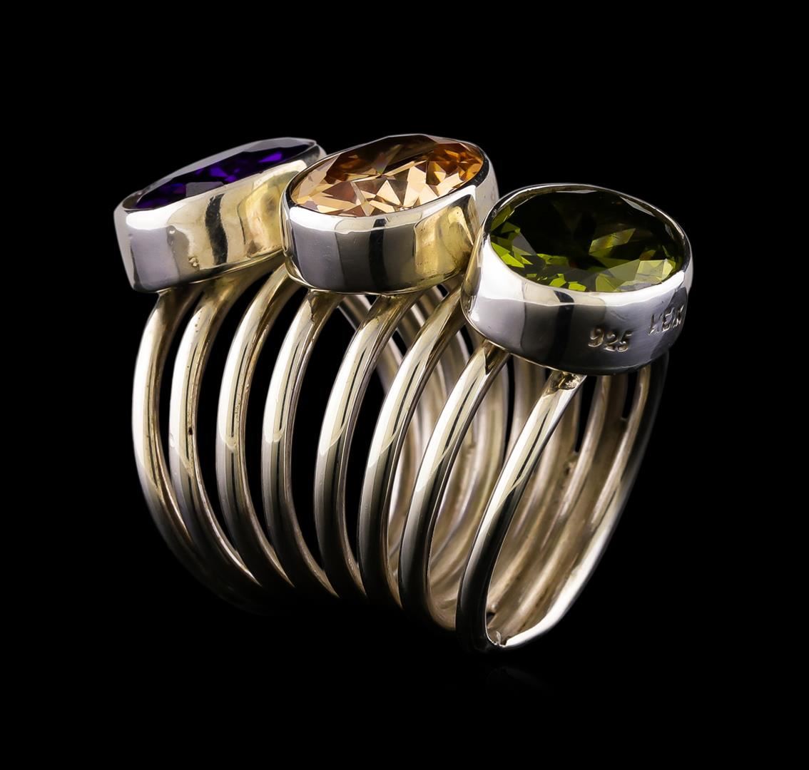 One of a kind high fashion sterling silver Ring weighing 20.6 grams. Containing: Purple Crystal, Peach Crystal, Dark Green Crystal. This sterling silver promises a lasting shine.