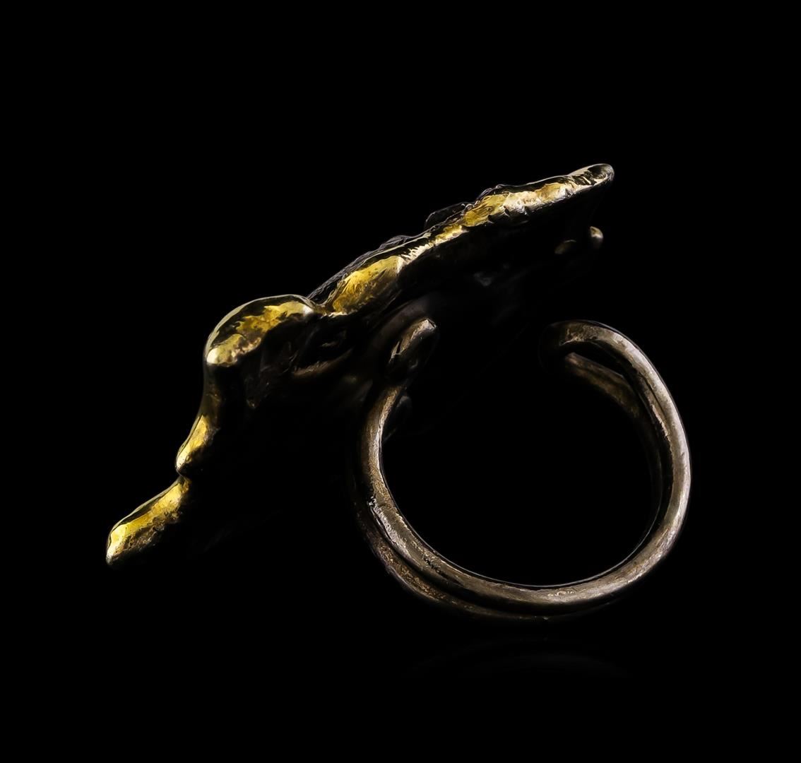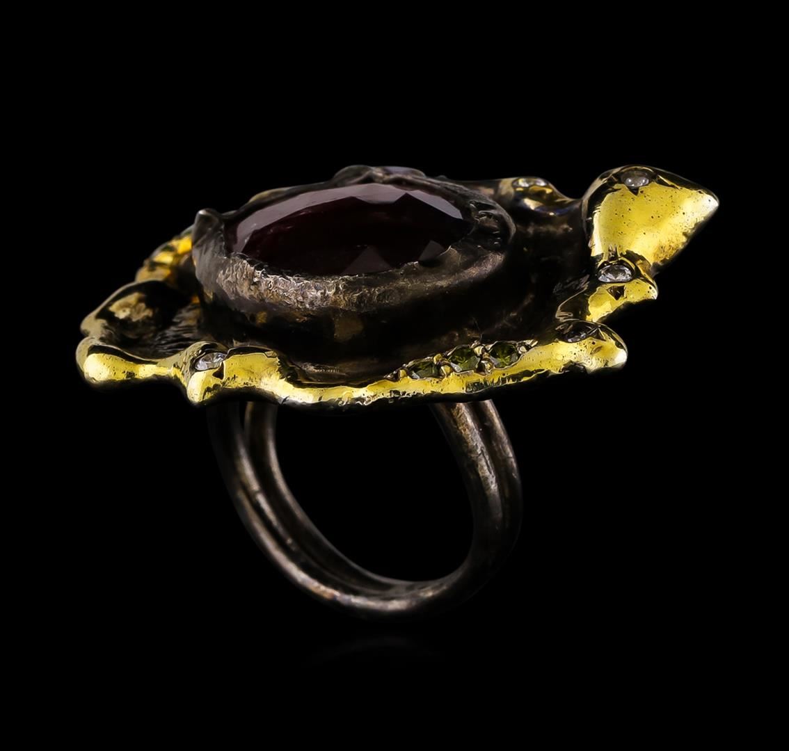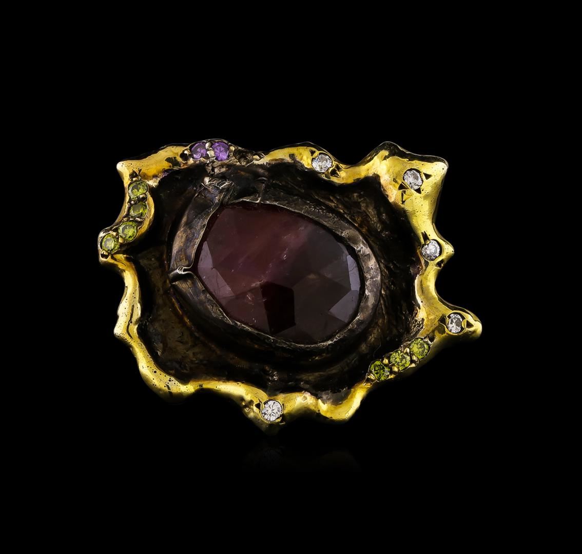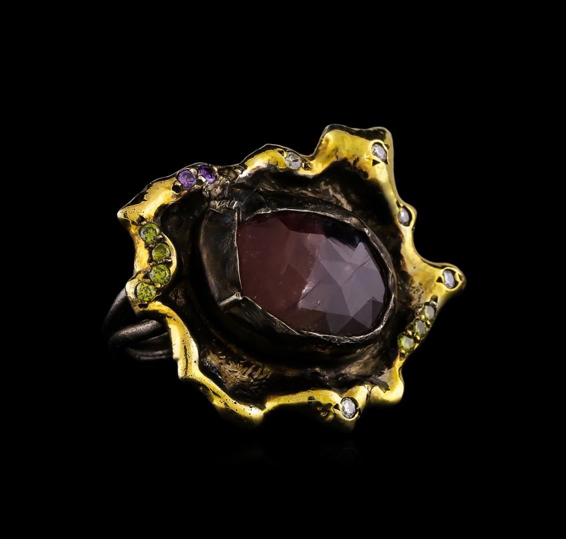 One of a kind high fashion sterling silver Ring weighing 16 grams. Black Antique texture. Containing: Ruby, Purple Crystal, White Crystal, Yellowish Green Crystal. This sterling silver promises a lasting shine.