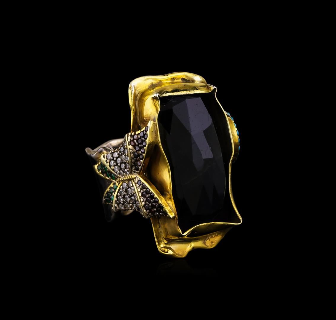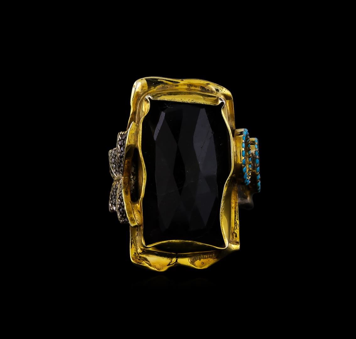 One of a kind high fashion sterling silver Ring weighing 17.7 grams. Containing: Blue Crystal, Created Turquoise, Brown Crystal, White Crystal, Green Crystal. This sterling silver promises a lasting shine.
