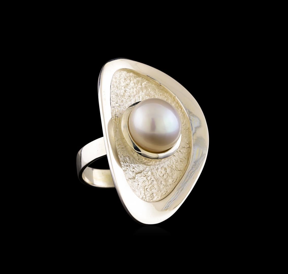 One of a kind high fashion sterling silver Ring weighing 12.8 grams. Containing: Natural Button Pearl. This sterling silver promises a lasting shine.