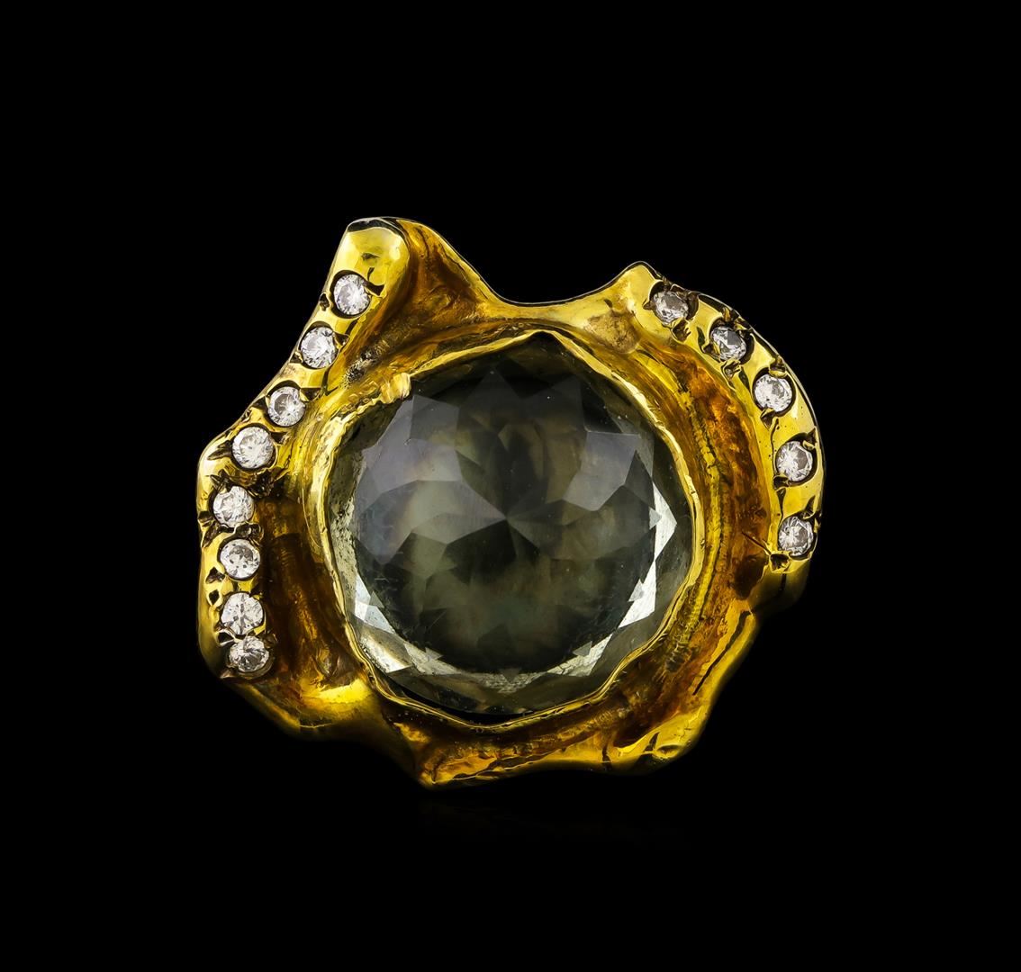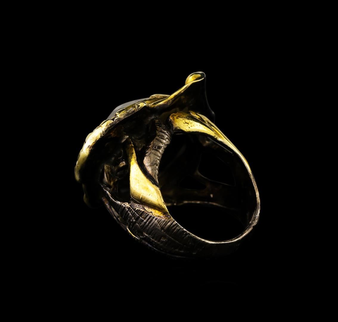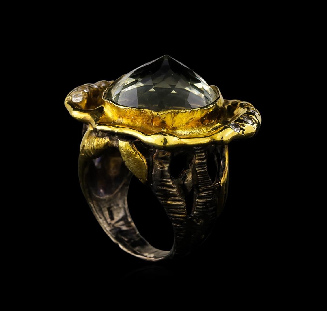 One of a kind high fashion sterling silver Ring weighing 23.4 grams. Black Antique texture. Containing: Green Quartz, White Crystal. This sterling silver promises a lasting shine.
