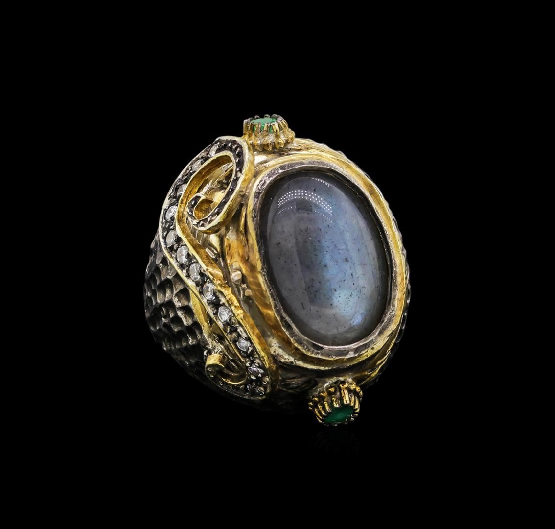One of a kind high fashion sterling silver Ring weighing 23.2 grams. Black Antique texture. Containing: Labradorite, Green Chalcedony, White Crystal. This sterling silver promises a lasting shine.