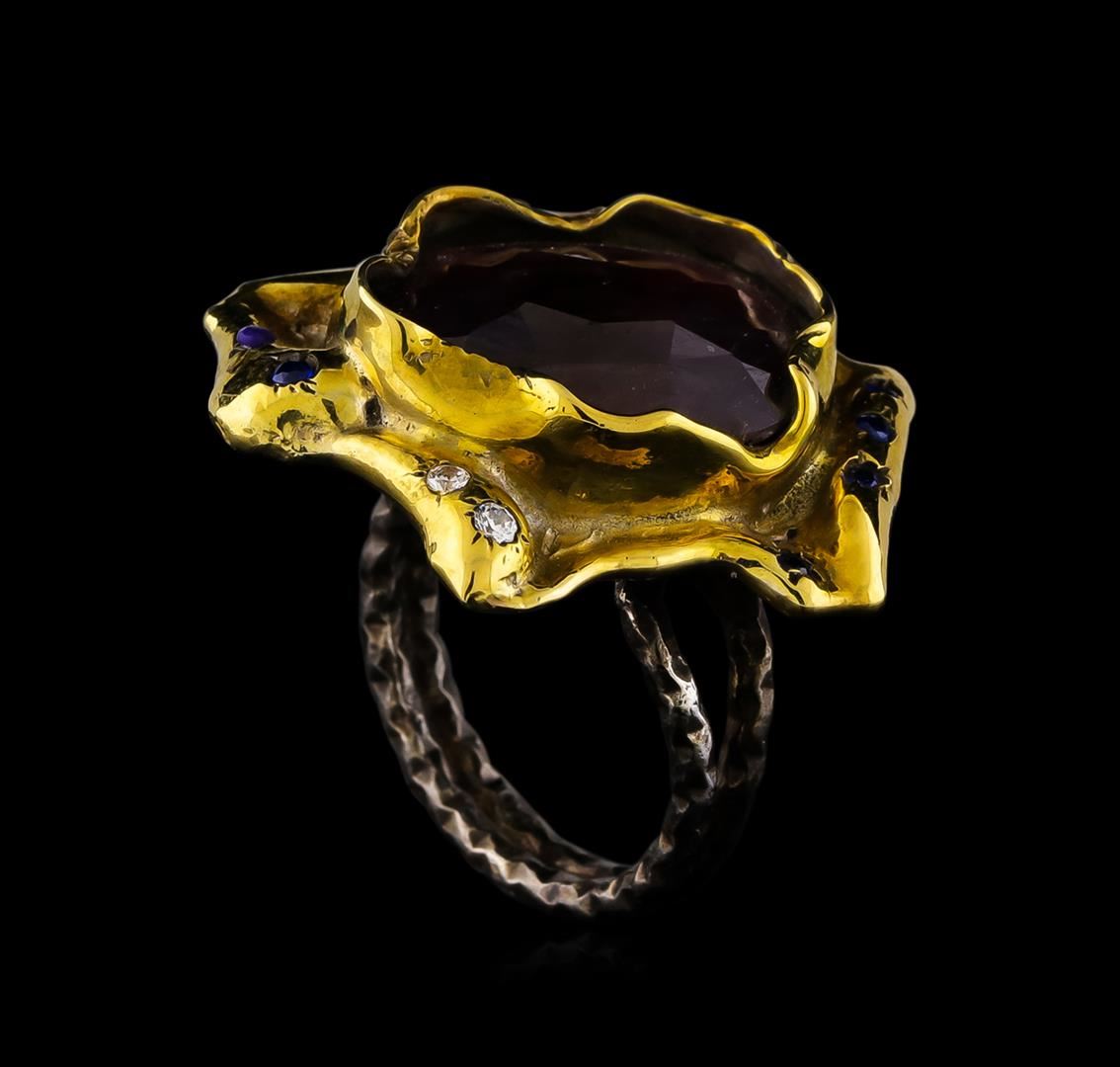One of a kind high fashion sterling silver Ring weighing 14.9 grams. Black Antique texture. Containing: Ruby, White Crystal, Blue Crystal. This sterling silver promises a lasting shine.
