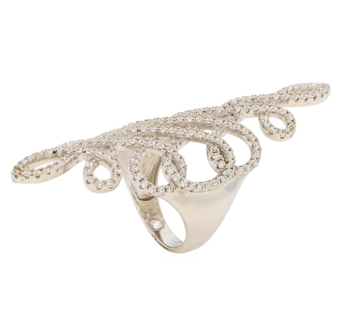 One of a kind high fashion sterling silver Ring weighing 8.6 grams. Containing: Cubic Zirconia. This sterling silver promises a lasting shine.