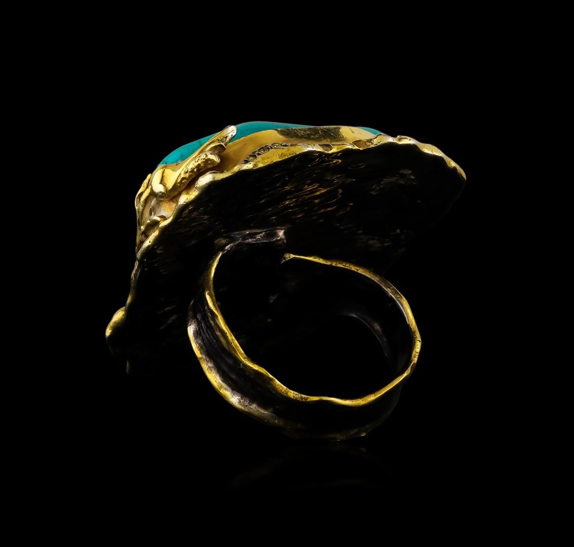 One of a kind high fashion sterling silver Ring weighing 36.1 grams. Containing: Turquoise, Yellow Crystal. This sterling silver promises a lasting shine.