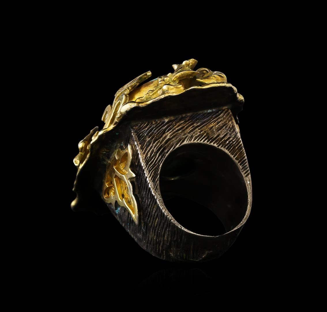 One of a kind high fashion sterling silver Ring weighing 40.4 grams. Black Antique texture. Containing: Created Turquoise. This sterling silver promises a lasting shine.