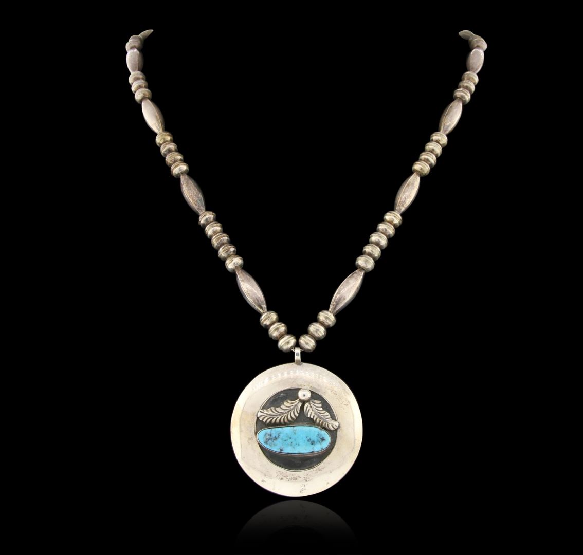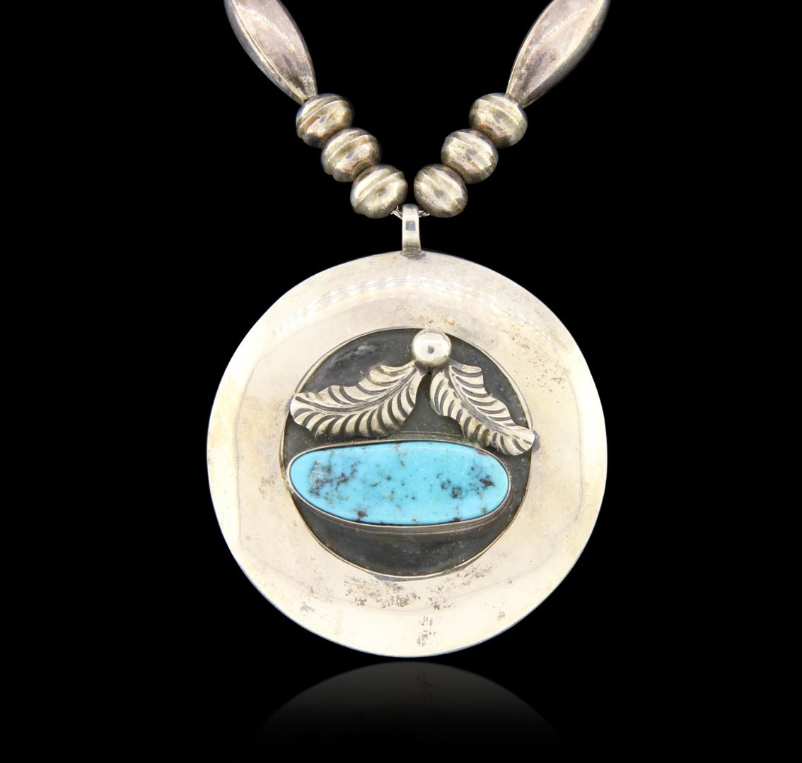 Vintage Sterling Silver and Turquoise Necklace signed by Artist Tom Bahe. The necklace is 18" and the medallion is 1.5" in diameter. Total weight is 33.28 grams.