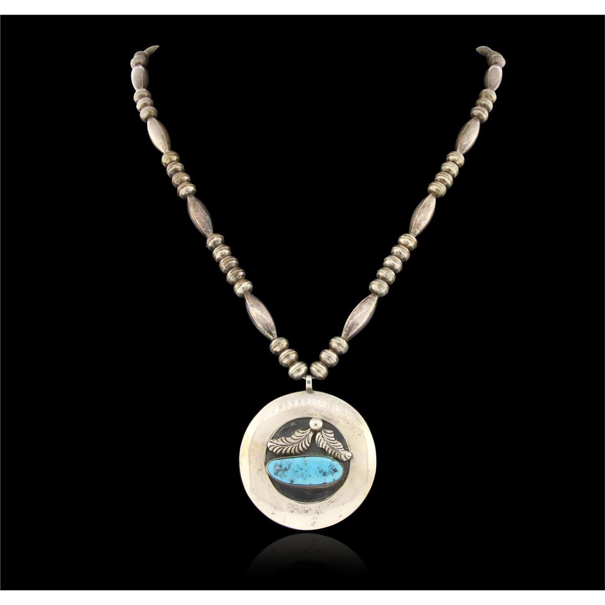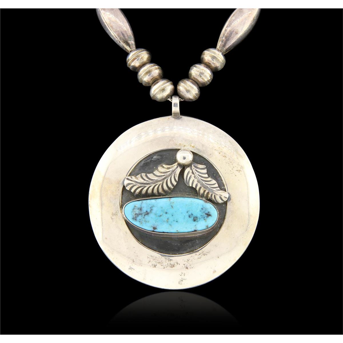 Vintage Sterling Silver and Turquoise Necklace signed by Artist Tom Bahe. The necklace is 18" and the medallion is 1.5" in diameter. Total weight is 33.28 grams.