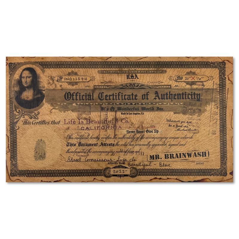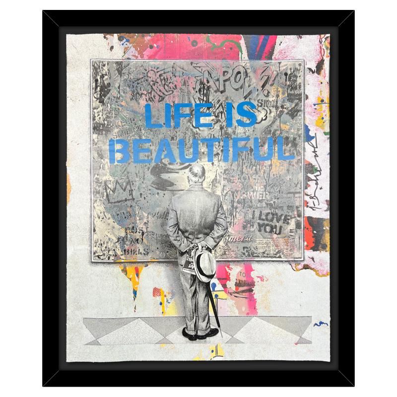 "Street Connoisseur - Life is Beautiful (Blue)" is a unique (UNIQ) mixed media on deckle edge paper by Mr. Brainwash, hand signed inverso and bearing the thumbprint of the artist. This piece comes custom framed. Includes Certificate of Authenticity. Measures approx. 20" x 24" (frame), 16" x 20" (image).