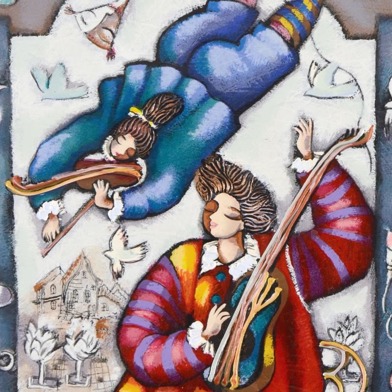 "String Duet" is a hand embellished limited edition serigraph on canvas by Michael Kachan, roman numbered inverso and hand signed by the artist. Includes a Letter of Authenticity. Measures approx. 15" x 22" (image).
