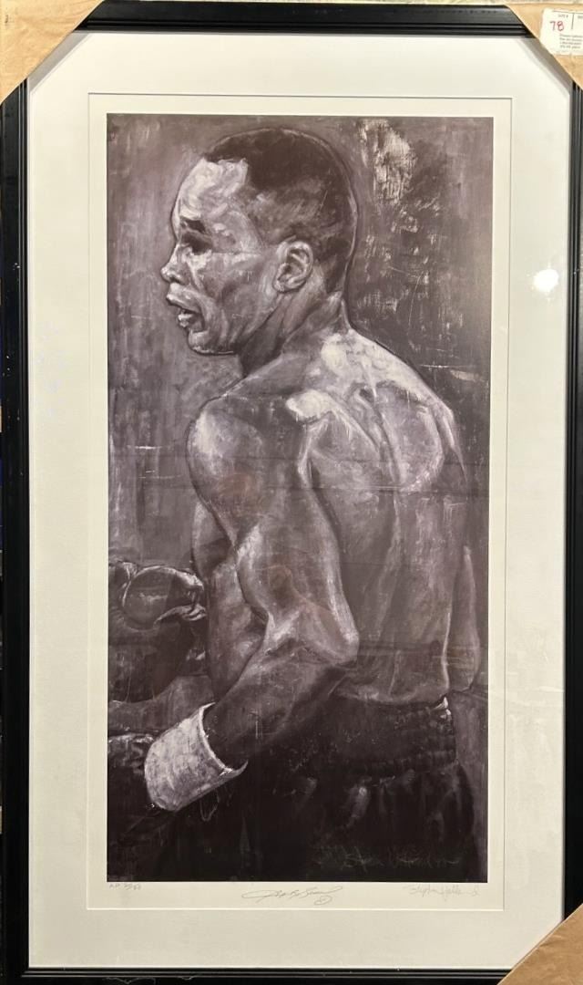 Sugar Ray Leonard, signed by Sugar Ray & artist is a framed 40" x 20" paper Lithograph AP 21/60 by Stephen Holland. Framed: 41.5" x 27" w/COA