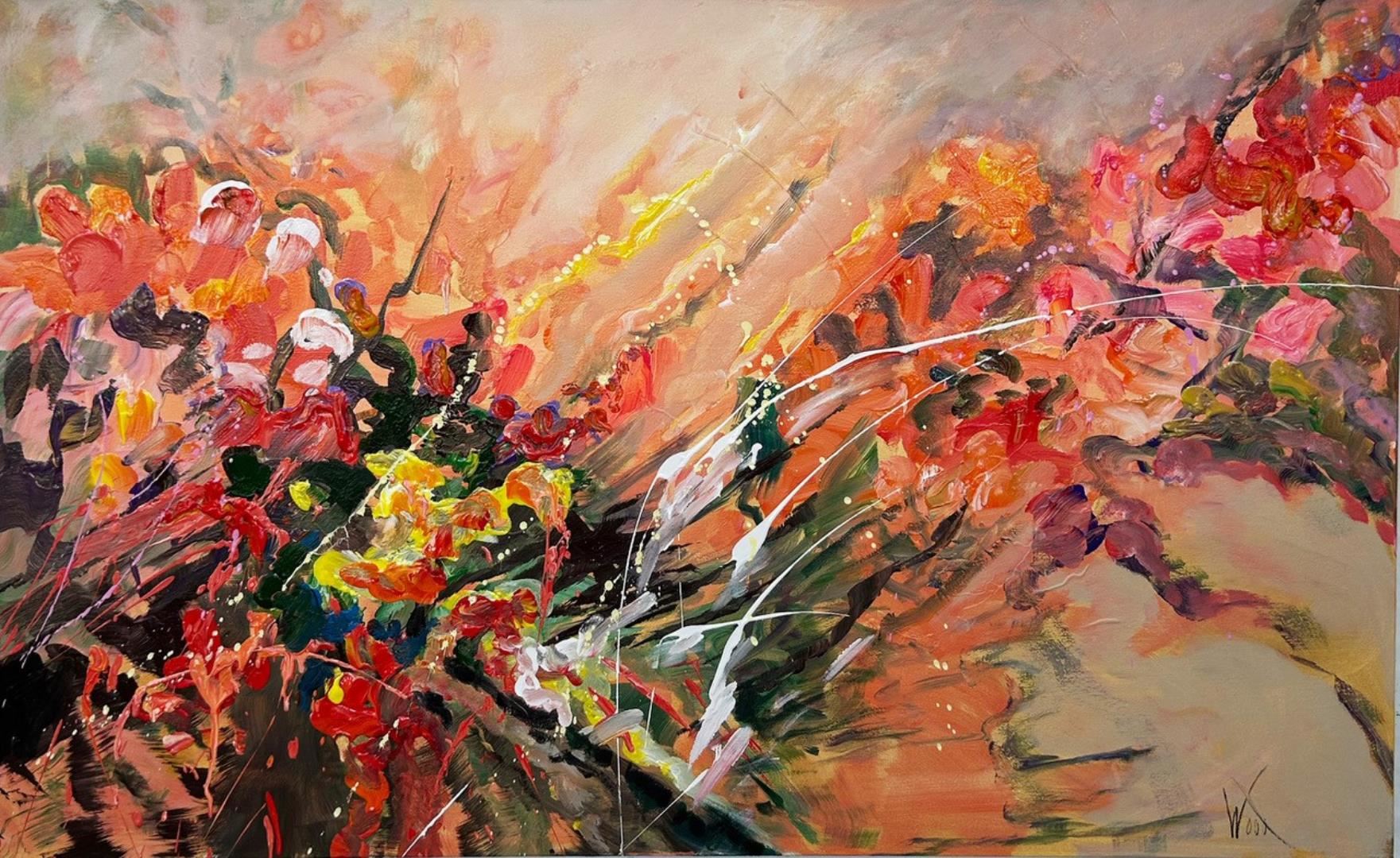 An impressionistic interpretation of wildflowers 30x48" acrylic painting on stretched canvas, finished with a Matt black floating frame.