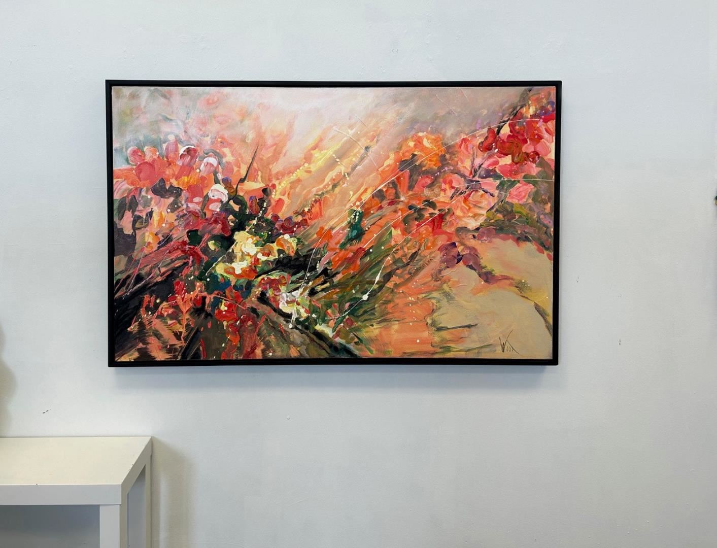 An impressionistic interpretation of wildflowers 30x48" acrylic painting on stretched canvas, finished with a Matt black floating frame.