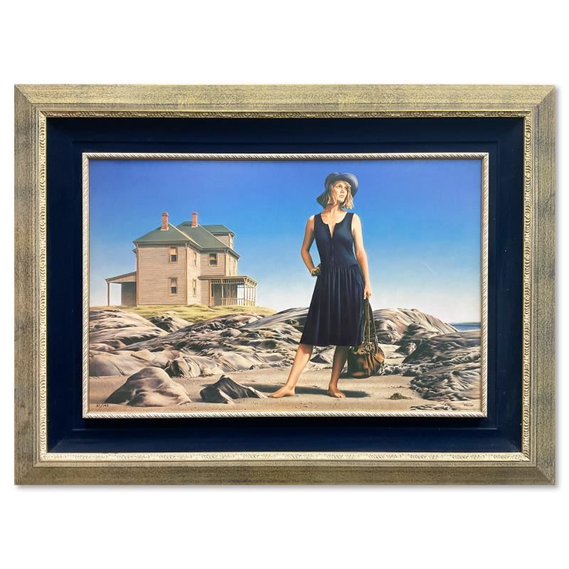 "Summer Reflections (Heather)" is a limited edition giclee on canvas by Paul Kelley, numbered 51/195 and hand signed by the artist. This piece comes framed. Includes Letter of Authenticity. Measures approx. 38" x 51" (frame), 23.5" x 36.5" (image). ** Please note: There is a scuff on the right of the image between the figure and the right frame panel. There is also some wear on the frame. **