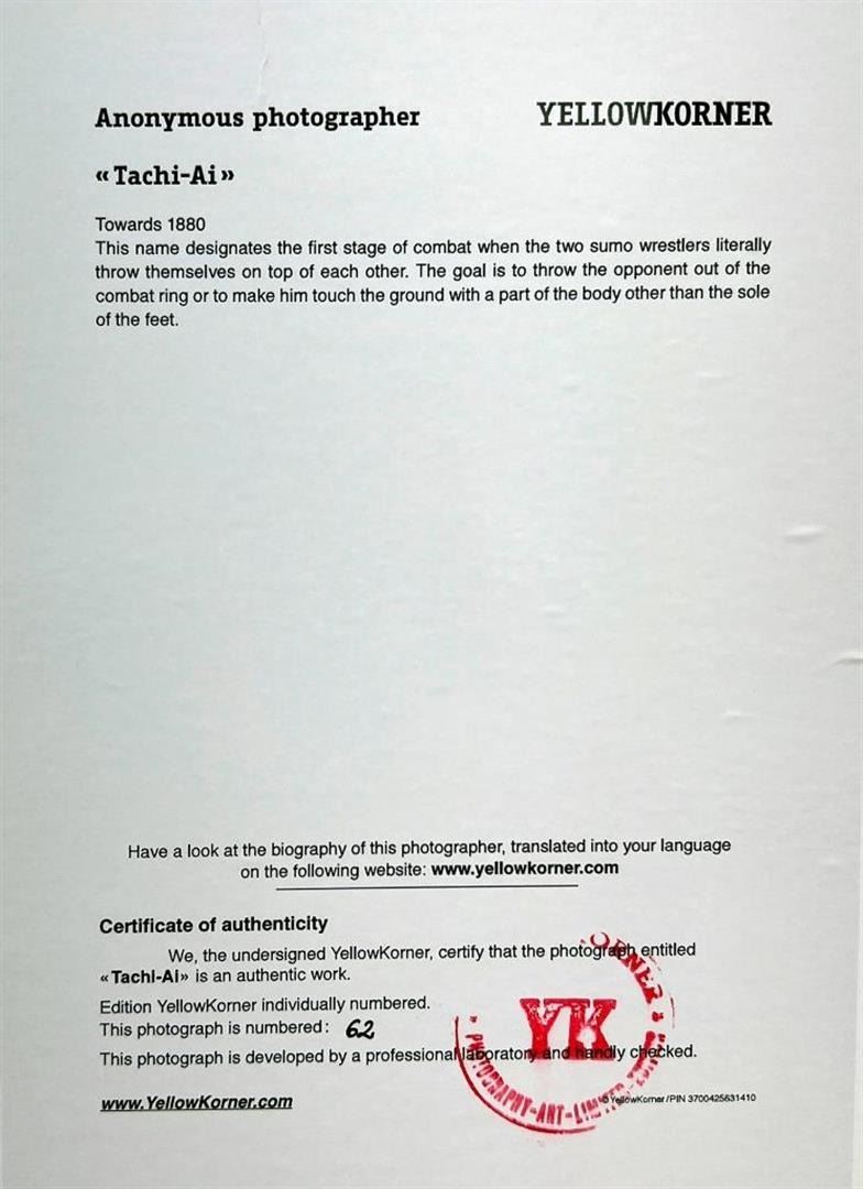 Sumo Wrestling Japan Wrestler Tachi-Ai YellowKorner Certified Photograph. Certificate of Authenticity from YellowKorner affixed to the back. Matted Dimensions 16"x20". Protected with Clear Mylar Sleeve.