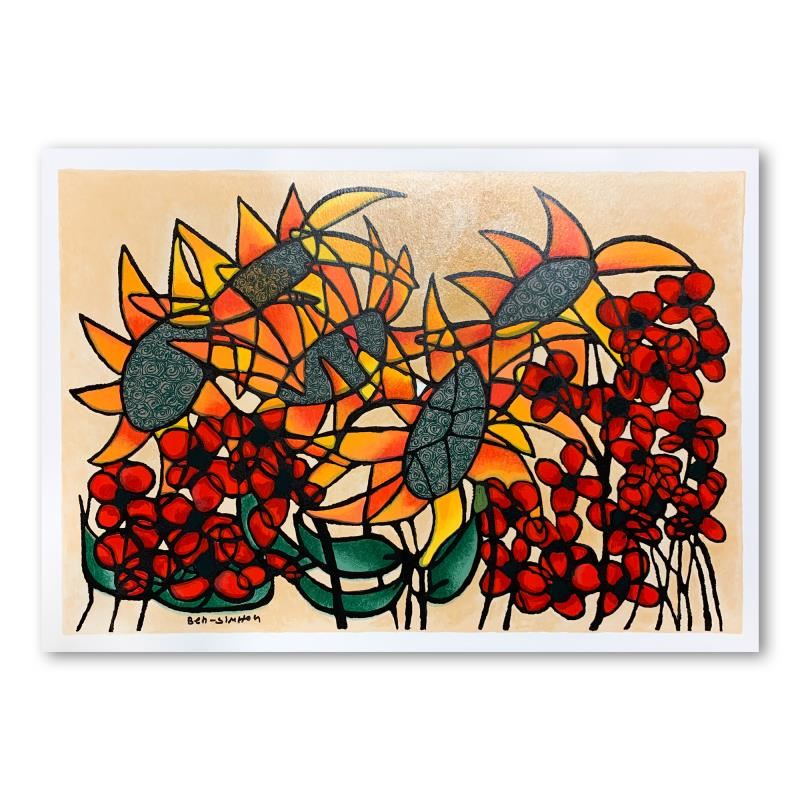 "Sunflowers" is a limited edition serigraph on paper by Ben Simhon. It is numbered and hand signed and includes a letter of authenticity. Measures approximately 18" x 27" (image).