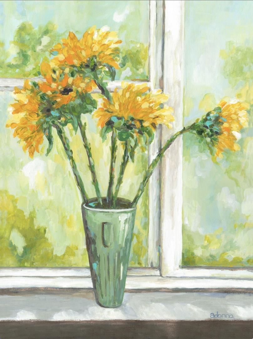 A charming 20x20" acrylic painting of sunflowers in a vase by Adonna . w/COA