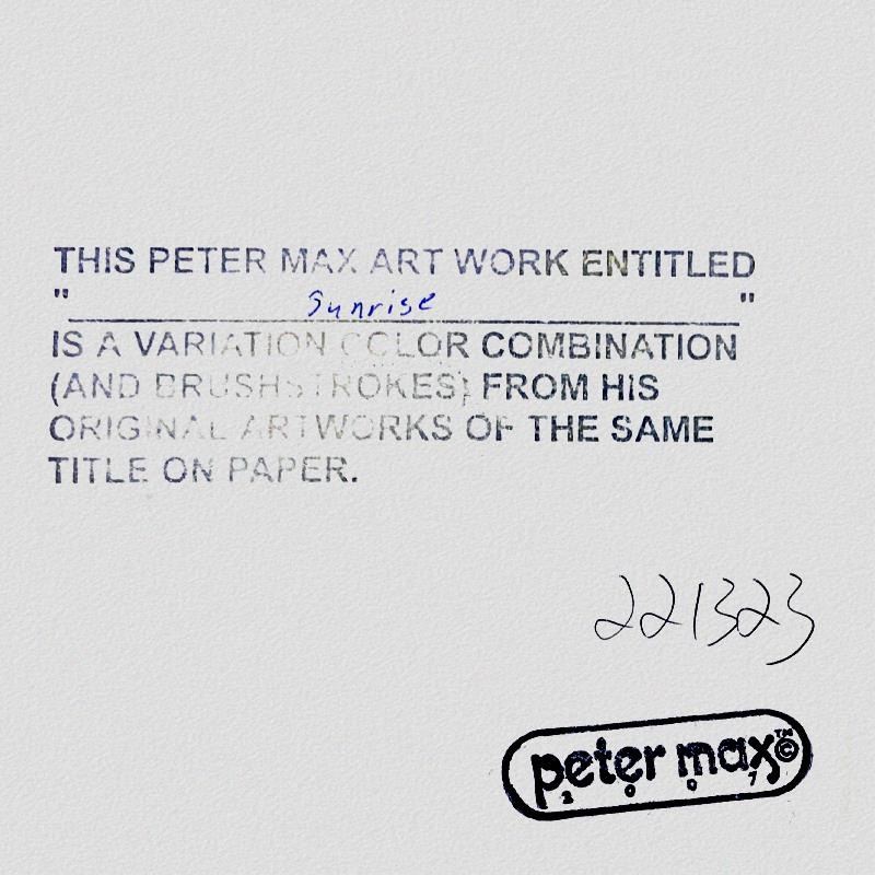 "Sunrise 2000" is a one-of-a-kind mixed media on paper, hand signed by Peter Max. The piece comes custom framed with a backside cutout to display Peter Max Studio registration number 221323 certifying authenticity. Measures approximately 48" x 36" (frame), 36" x 24" (image). This item requires special handling and may have a longer than usual turnaround.