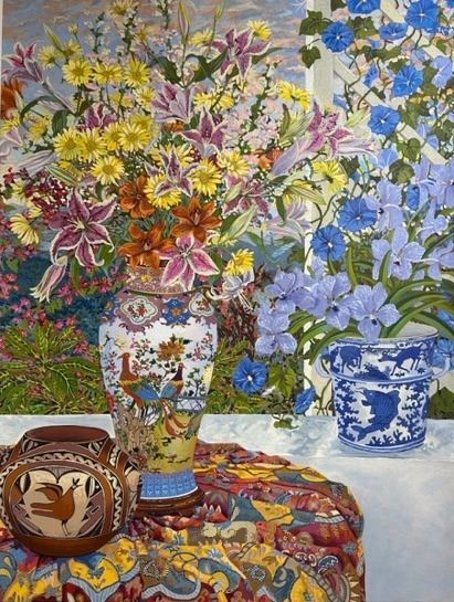 "Sunrise and Morning Glories" is a limited edition signed and numbered serigraph on paper by John Pow - This piece is 33" x 25".