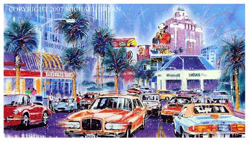 Michael Bryan captures the thrill of Sunset Blvd in Hollywood , in it's heyday. Originally created for the interiors of all the Hamburger Hamlet restaurants nationwide, this Unique 1/1 hand-painted giclee on canvas measures 22x40"