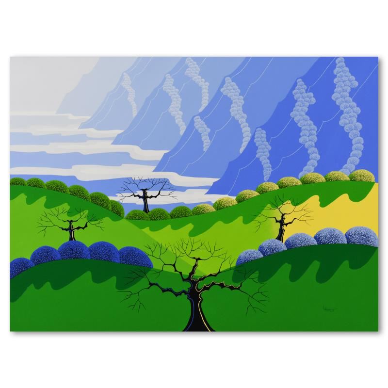 "Sunset at Pebble Beach, 18th Hole" is an original oil painting on canvas by Larissa Holt, protege of acclaimed artist Eyvind Earle. This piece is a hand signed by the artist and comes gallery wrapped. Includes Letter of Authenticity. Measures approx. 40" x 30" (image).