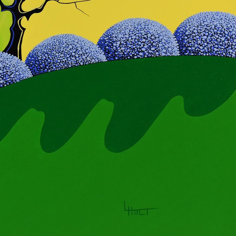 "Sunset at Pebble Beach, 18th Hole" is an original oil painting on canvas by Larissa Holt, protege of acclaimed artist Eyvind Earle. This piece is a hand signed by the artist and comes gallery wrapped. Includes Letter of Authenticity. Measures approx. 40" x 30" (image).