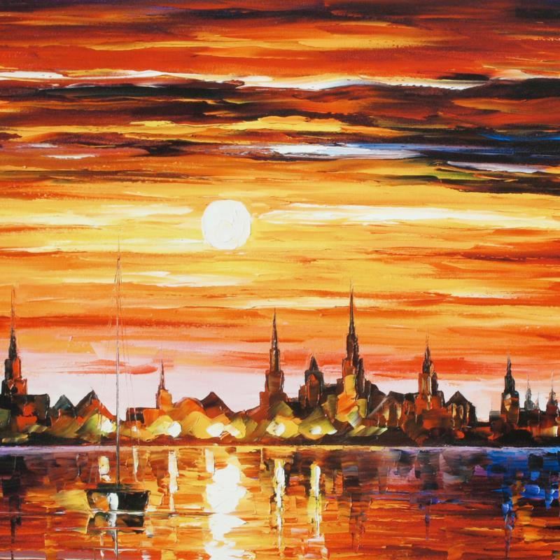 Leonid Afremov's (1955-2019) masterful use of color and texture make his paintings unique collectibles that are sure to brighten any wall. "Sunset in Barcelona" is a limited edition giclee on canvas. The piece is numbered and bears the artist's authorized signature. This piece comes gallery wrapped. Includes Letter of Authenticity. Measures approx. 24" x 18" (image). This item requires special handling and may have a longer than usual turnaround.