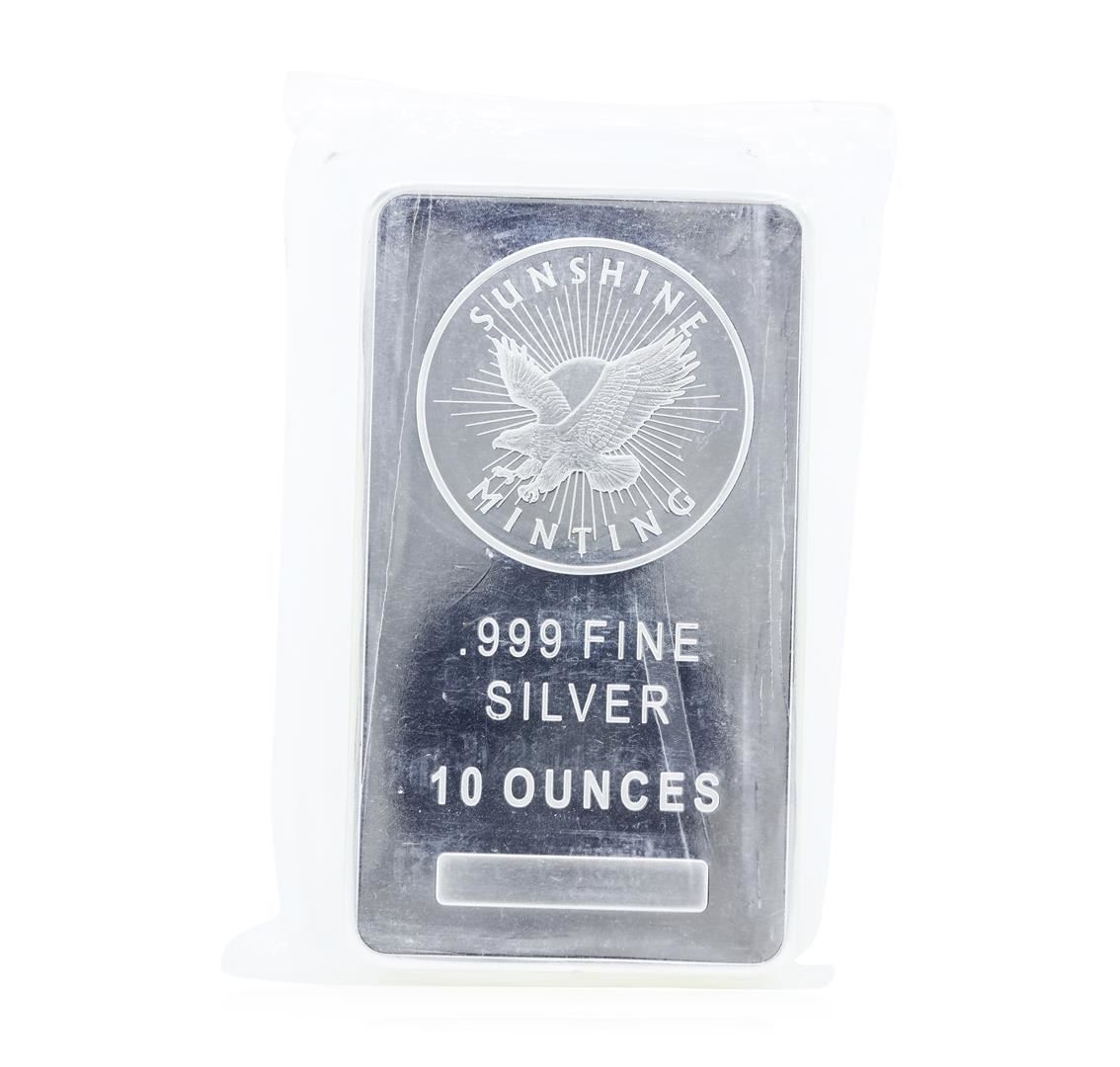 One ten ounce .999 fine silver bar from Sunshine Minting.