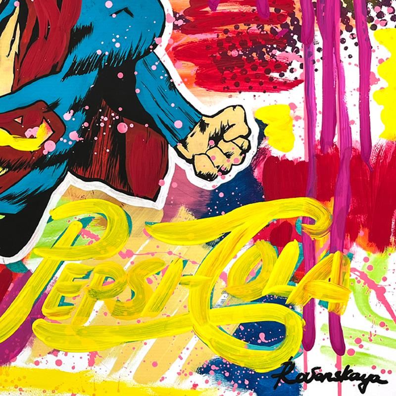 "Superhero" is a one-of-a-kind mixed media on deckle edge paper by Nastya Rovenskaya; hand signed by the artist. This piece comes custom framed and includes letter of authenticity. Measures approximately 36" x 46" (framed), 30" x 40" (image).