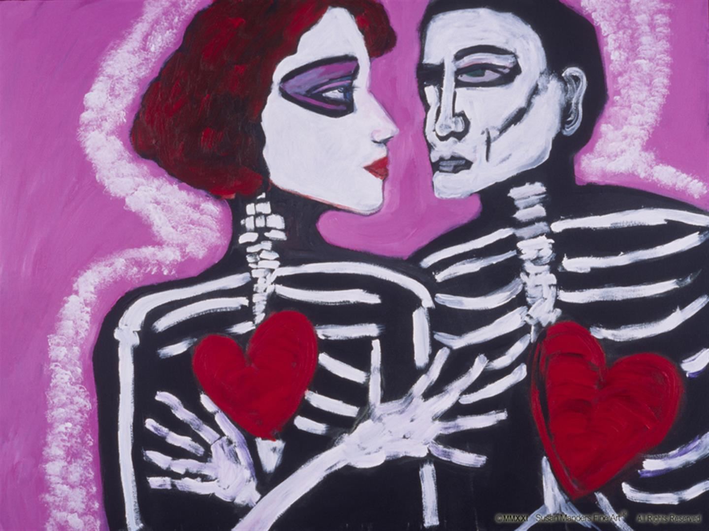 Susan Manders "Dia de los Muertos". This piece is 40 x 30 original oil on canvas. Manders works are represented in fine collections internationally & archived by the National Museum of Women in the Arts ,Washington, DC. As the 2nd woman to be selected a US Olympic Artist, Manders joins an exclusive club of internationally acclaimed artists.