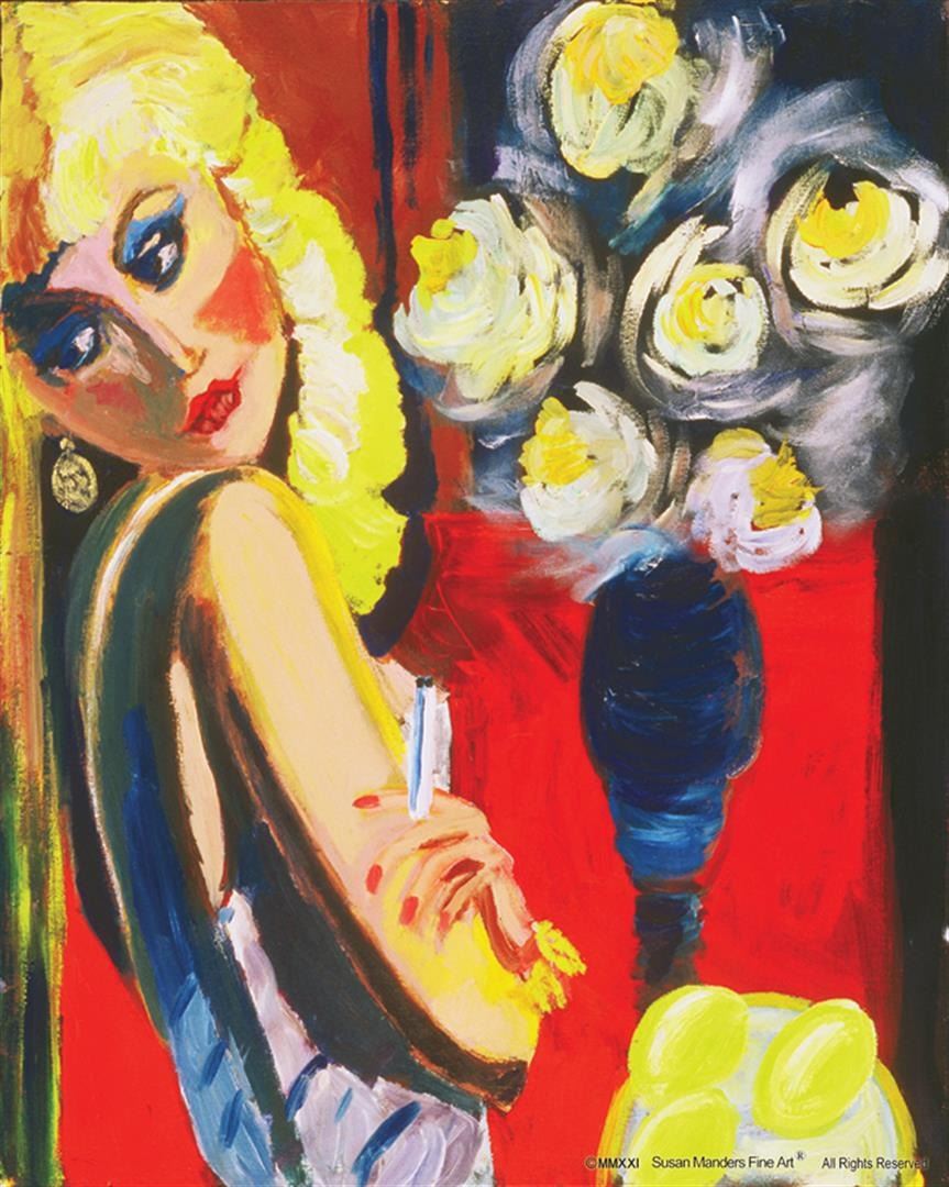 She's a sexy blonde who knows her way around, in Susan Manders "Going My Way" is a 24 x 30" original oil on canvas. Manders works are represented in fine collections internationally & archived by the National Museum of Women in the Arts ,Washington, DC. As the 2nd woman to be selected a US Olympic Artist, Manders joins an exclusive club of internationally acclaimed artists.