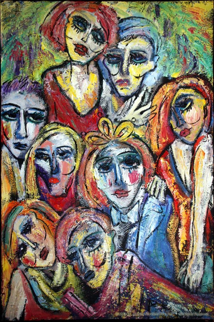 This group hangs together in Susan Manders "In Sync", a 40 x 60" original oil on canvas. Manders works are represented in fine collections internationally & archived by the National Museum of Women in the Arts ,Washington, DC. As the 2nd woman to be selected a US Olympic Artist, Manders joins an exclusive club of internationally acclaimed artists.