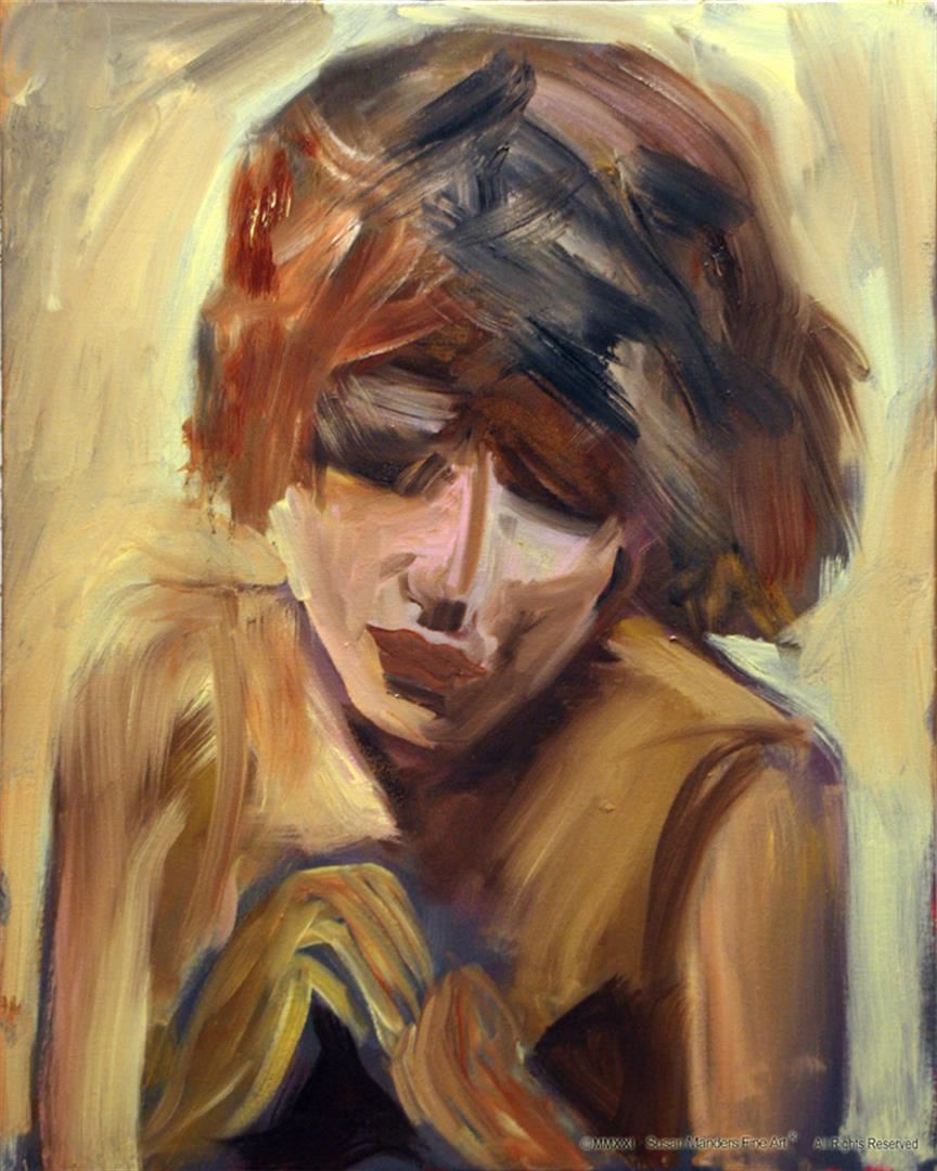 Serious and determined, she plots her next move in Susan Manders "My Secret". A 30 x 24" original oil on canvas. Manders works are represented in fine collections internationally & archived by the National Museum of Women in the Arts ,Washington, DC.   As the 2nd woman to be selected a US Olympic Artist, Manders joins an exclusive club of internationally acclaimed artists.