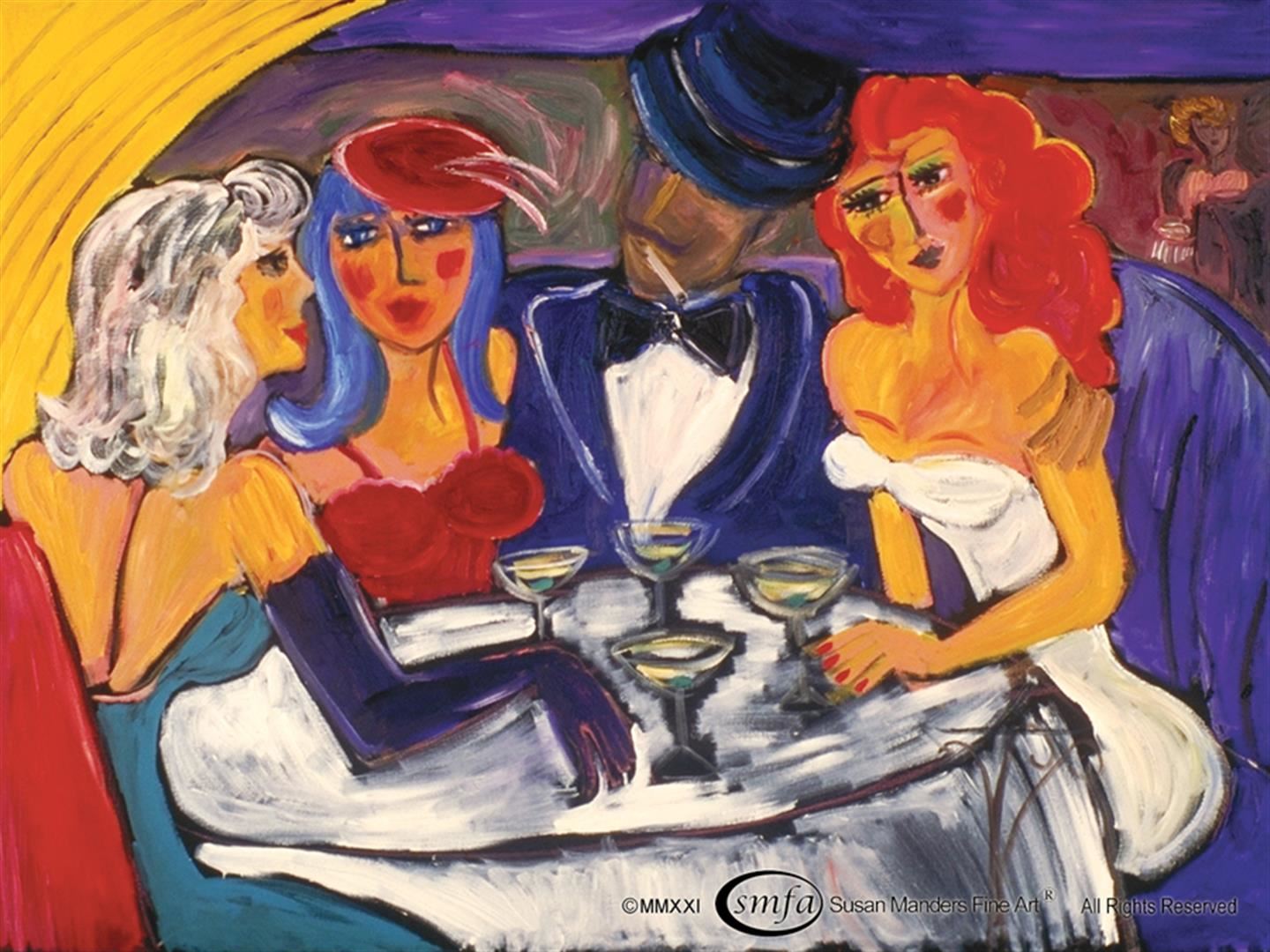 Susan Manders Original "Dining with the Sharkettes" is a 48x36" original oil on canvas. "Martinis are Up. We'll worrry about dinner later. " Susan Manders Original was only the 2nd Woman selected as a US Olympic artist in 2004. Manders works are represented in fine collections internationally & archived by the National Museum of Women in the Arts ,Washington, DC. As the 2nd woman to be selected a US Olympic Artist, Manders joins an exclusive club of internationally acclaimed artists.