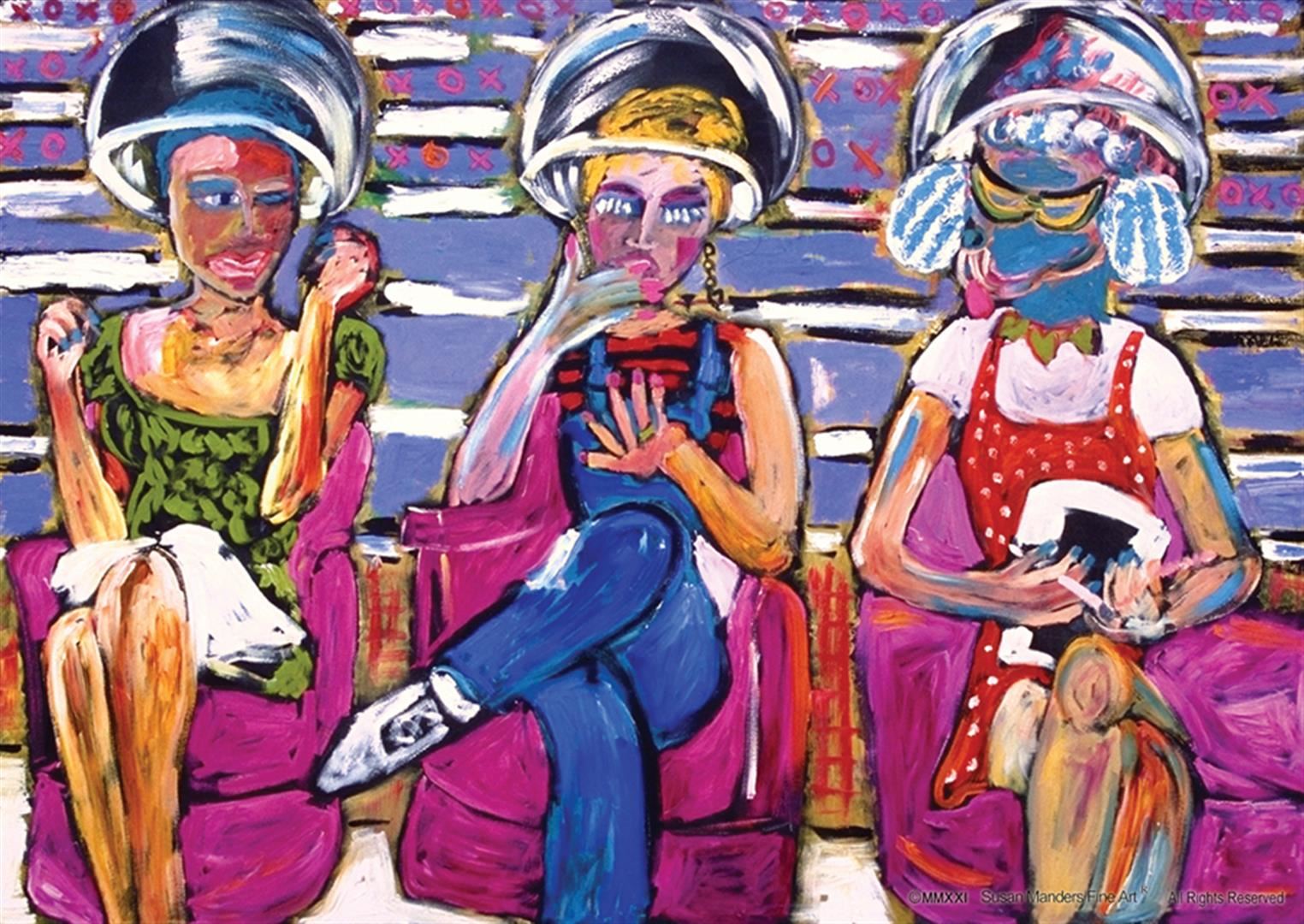 Susan Manders Original "Puttin' On The Dawg". This piece is 64 x 48 original oil on canvas. Manders works are represented in fine collections internationally & archived by the National Museum of Women in the Arts ,Washington, DC. As the 2nd woman to be selected a US Olympic Artist, Manders joins an exclusive club of internationally acclaimed artists.