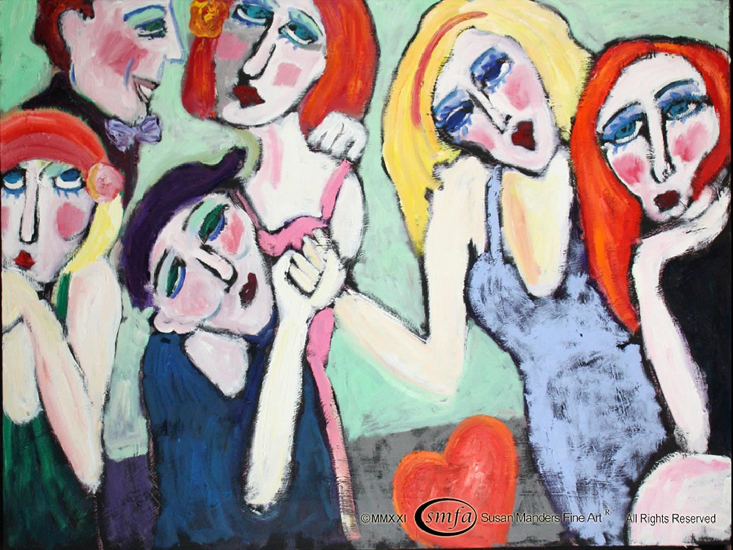 Susan Manders Original "Sextet" is a 48x36" original oil on canvas. It takes a Village to understand her . Susan Manders Original was only the 2nd Woman selected as a US Olympic artist in 2004. Manders works are represented in fine collections internationally & archived by the National Museum of Women in the Arts ,Washington, DC. As the 2nd woman to be selected a US Olympic Artist, Manders joins an exclusive club of internationally acclaimed artists.
