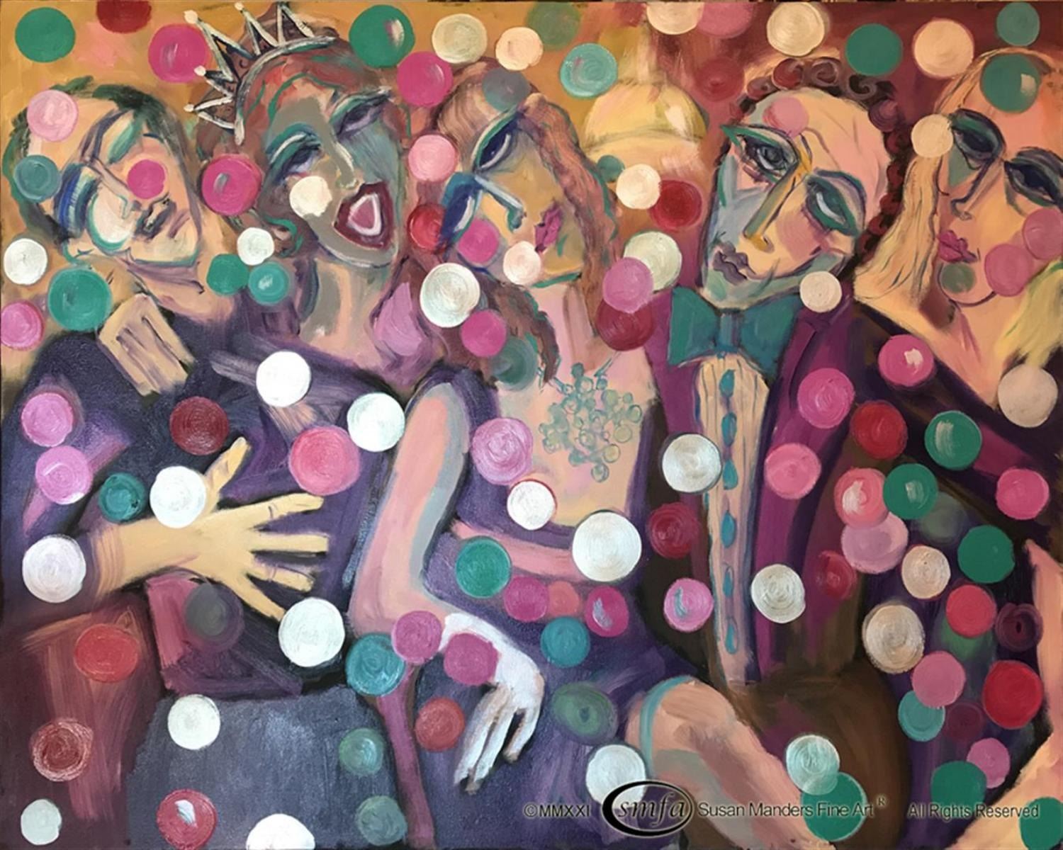 Susan Manders "Party Time" is a 60x48" original oil on canvas. Let the bubbly flow . We are all in . Susan Manders was only the 2nd Woman selected as a US Olympic artist in 1984.