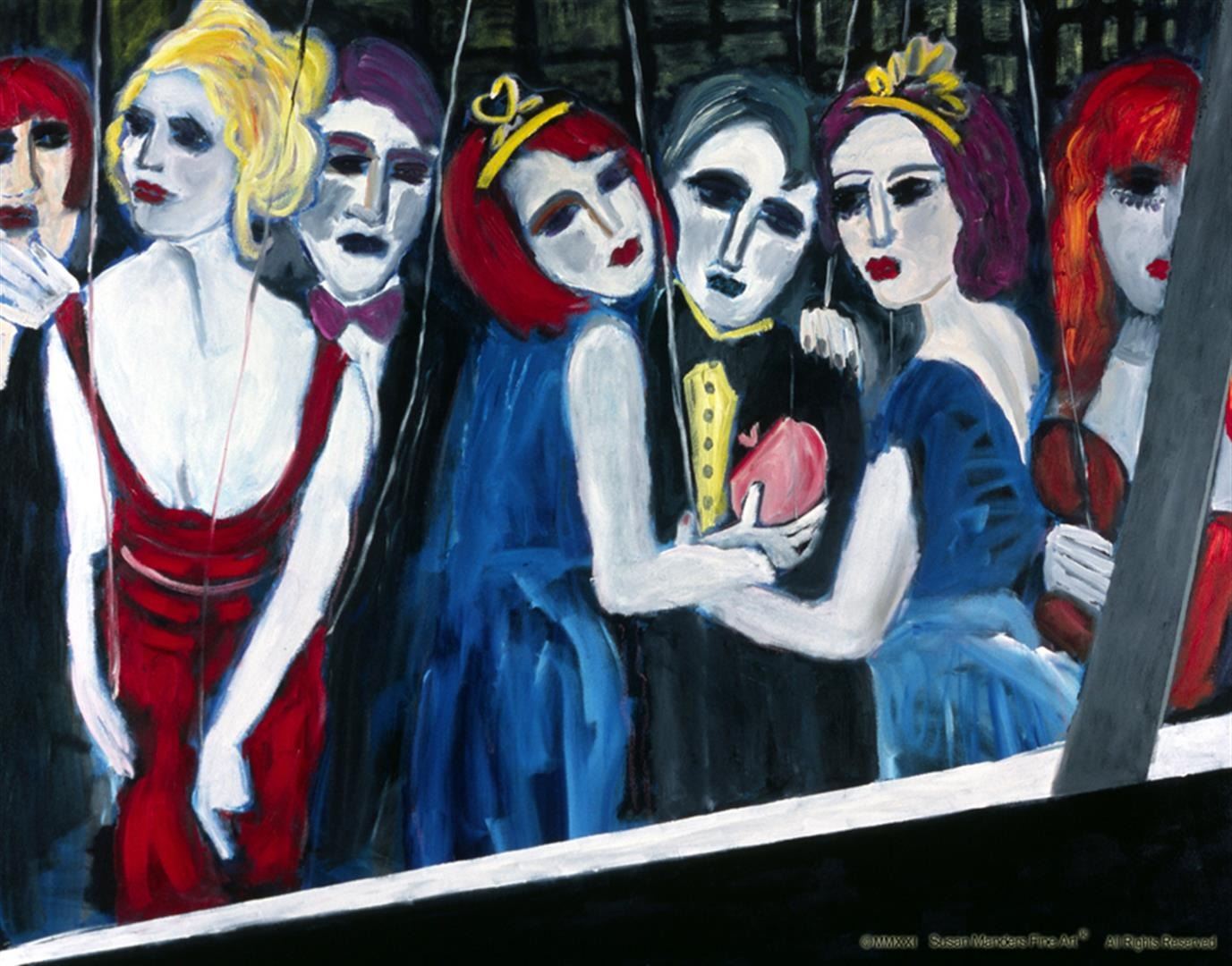 The balloons are not in the frame, but their strings take on new meaning without them in Susan Manders "Pull My Strings", a 60 x 48" original oil on canvas. Manders works are represented in fine collections internationally & archived by the National Museum of Women in the Arts ,Washington, DC.   As the 2nd woman to be selected a US Olympic Artist, Manders joins an exclusive club of internationally acclaimed artists.