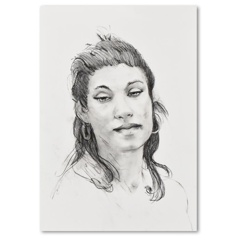 "Susanne" is an original charcoal drawing on board by Charles Lynn Bragg, hand signed by the artist. Includes Letter of Authenticity. Measures approx. 9" x 13" (image).
