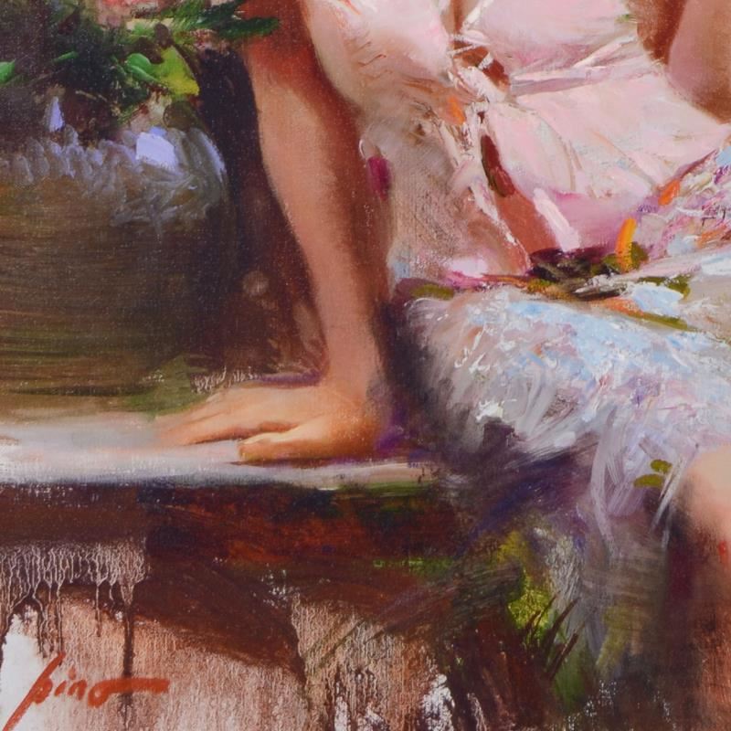 Sweet Scent by Pino (1939-2010). Pino's portraits allow glimpses into intensely personal, intimate spaces, conveying emotion through rich, warm color and sensual brushwork. "Sweet Scent" is an artist-embellished limited edition giclee on canvas by Pino (1939-2010). The piece is numbered, hand signed, custom framed, and includes certificate of authenticity. Measures approx. 27.5" x 33.5" (frame), 20" x 26" (image). This item requires special handling and may have a longer than usual turnaround.