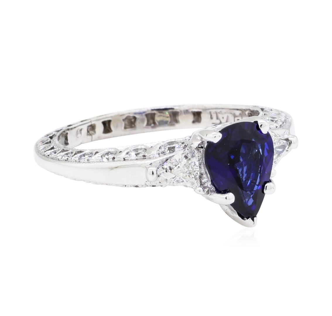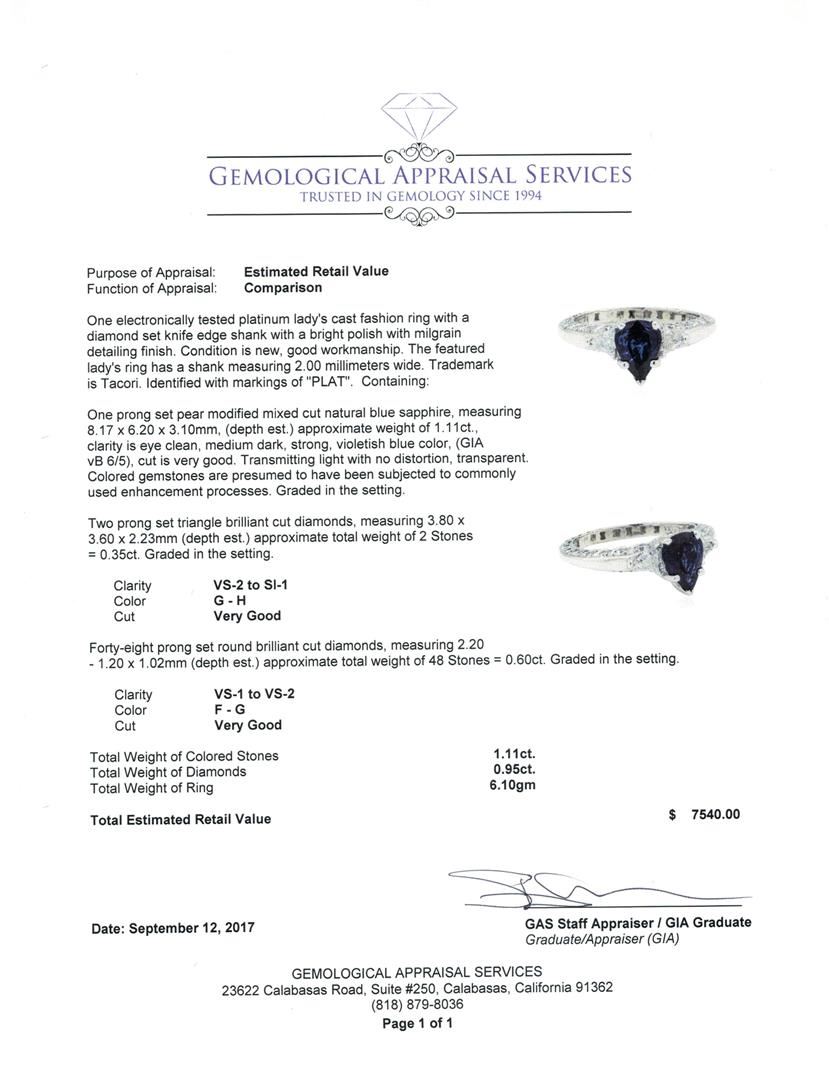 One electronically tested platinum lady's cast fashion ring with a diamond set knife edge shank with a bright polish with milgrain detailing finish. The featured lady's ring has a shank measuring 2.00 millimeters wide. Trademark is Tacori. Identified with markings of 'PLAT'. Condition is new, good workmanship. Containing: One prong set pear modified mixed cut natural blue sapphire, measuring 8.17 x 6.20 x 3.10mm, (depth est.) approximate weight of 1.11ct., clarity is eye clean, medium dark, strong, violetish blue color, (GIA vB 6/5), cut is very good. Transmitting light with no distortion, transparent. Colored gemstones are presumed to have been subjected to commonly used enhancement processes. Graded in the setting. Two prong set triangle brilliant cut diamonds, measuring 3.80 x 3.60 x 2.23mm (depth est.) approximate total weight of 2 Stones = 0.35ct. Graded in the setting. Color G - H Clarity VS-2 to SI-1 Cut Very Good Forty-Eight prong set round brilliant cut diamonds, measuring 2.20 - 1.20 x 1.02mm (depth est.) approximate total weight of 48 Stones = 0.60ct. Graded in the setting. Color F - G Clarity VS-1 to VS-2 Cut Very Good. Total Weight of Colored Stones 1.11ct.. Total Weight of Diamonds 0.95ct.. Total Weight of Ring 6.10gm GAS Appraised at $7540.00. GAS Appraised at $7,540.00.