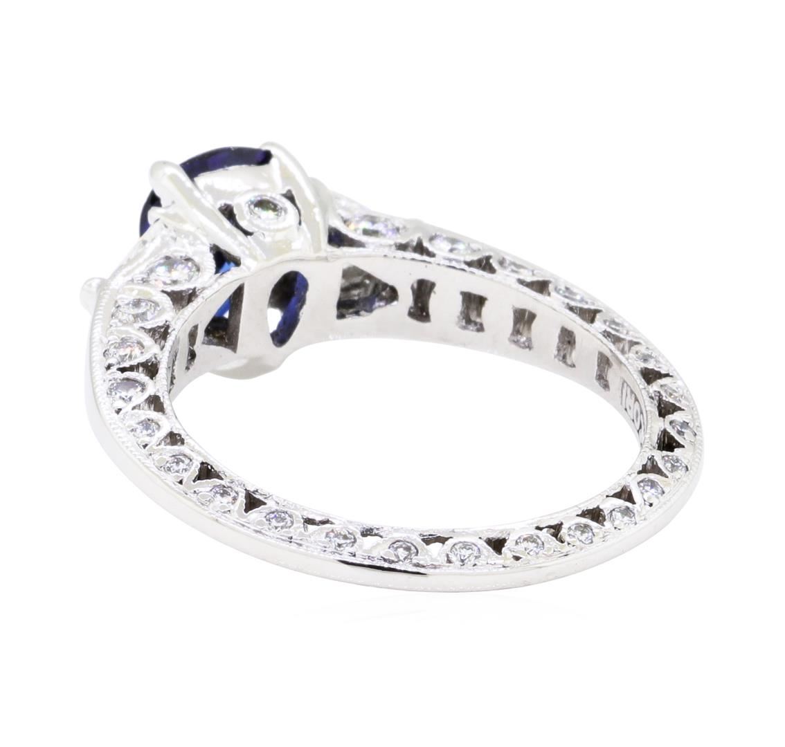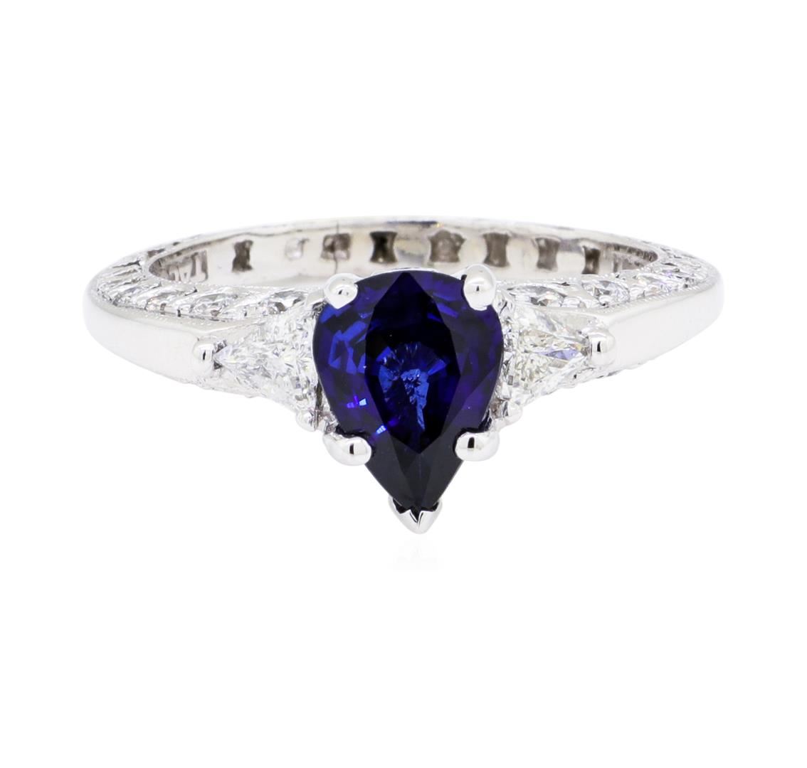One electronically tested platinum lady's cast fashion ring with a diamond set knife edge shank with a bright polish with milgrain detailing finish. The featured lady's ring has a shank measuring 2.00 millimeters wide. Trademark is Tacori. Identified with markings of 'PLAT'. Condition is new, good workmanship. Containing: One prong set pear modified mixed cut natural blue sapphire, measuring 8.17 x 6.20 x 3.10mm, (depth est.) approximate weight of 1.11ct., clarity is eye clean, medium dark, strong, violetish blue color, (GIA vB 6/5), cut is very good. Transmitting light with no distortion, transparent. Colored gemstones are presumed to have been subjected to commonly used enhancement processes. Graded in the setting. Two prong set triangle brilliant cut diamonds, measuring 3.80 x 3.60 x 2.23mm (depth est.) approximate total weight of 2 Stones = 0.35ct. Graded in the setting. Color G - H Clarity VS-2 to SI-1 Cut Very Good Forty-Eight prong set round brilliant cut diamonds, measuring 2.20 - 1.20 x 1.02mm (depth est.) approximate total weight of 48 Stones = 0.60ct. Graded in the setting. Color F - G Clarity VS-1 to VS-2 Cut Very Good. Total Weight of Colored Stones 1.11ct.. Total Weight of Diamonds 0.95ct.. Total Weight of Ring 6.10gm GAS Appraised at $7540.00. GAS Appraised at $7,540.00.