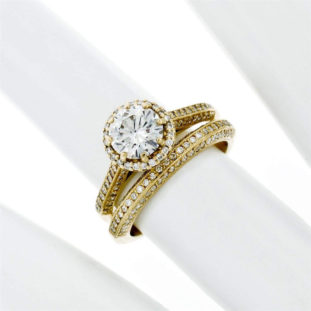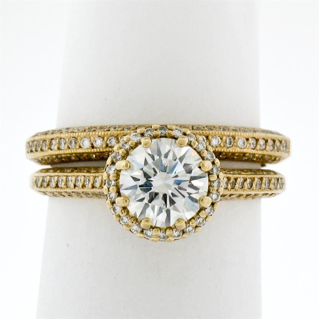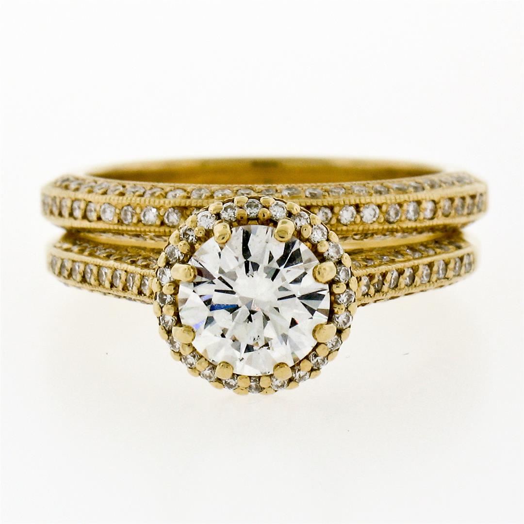 Tacori 18k Gold .79ct GIA Round Diamond Solitaire Engagement & Wedding Band Set. Please see photos and description for all available information. An estate solid 18k yellow gold engagement ring and wedding band by Tacori, with 1 Gia certified round brilliant cut natural diamond (G- VS2- 0.79ct), and 84 round brilliant cut natural diamonds (F/G- VVS2/VS1; 0.79ctw). The ring is size 4.5, weighs a total of 6.59 grams, and measures 8.55mm wide. Comes with all original relevant certifications.