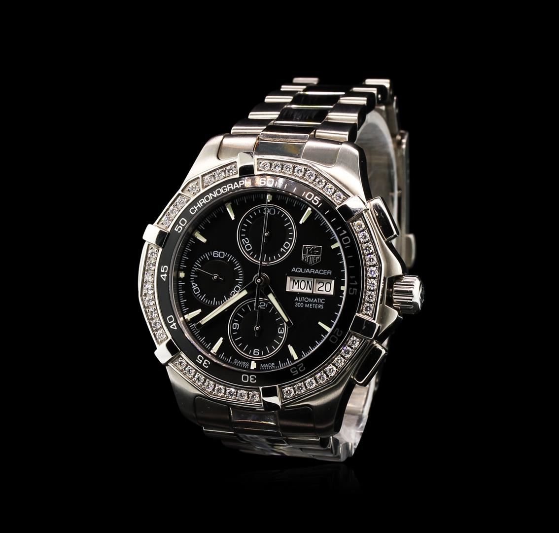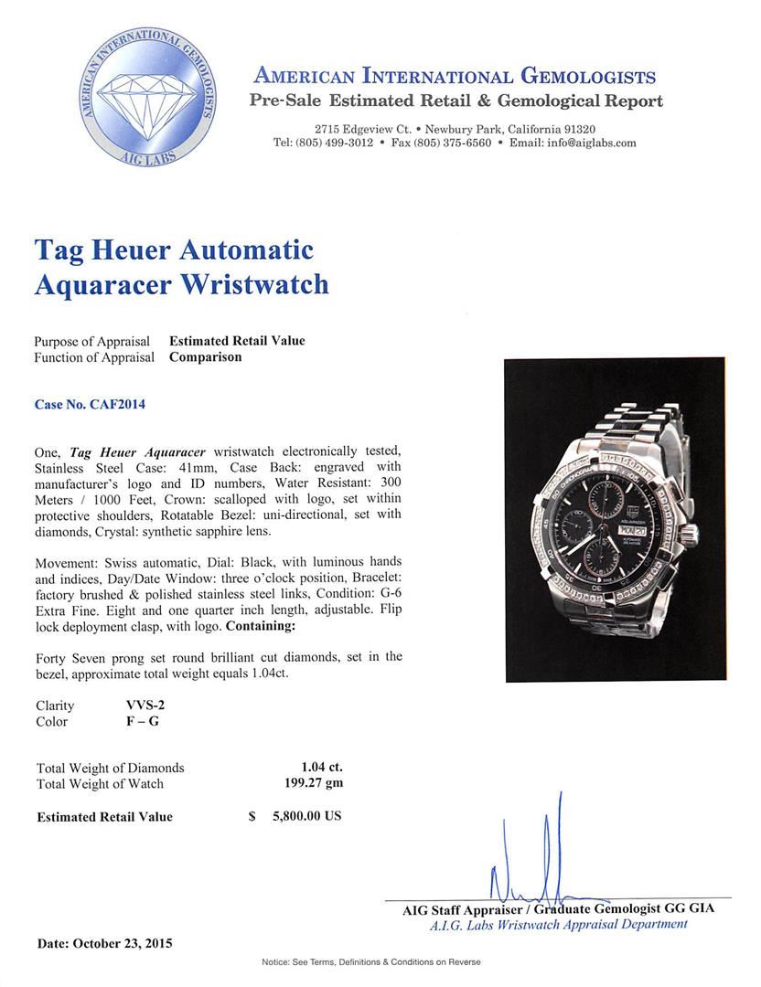 One, Tag Heuer Aquaracer wristwatch electronically tested, Stainless Steel Case: 41mm, Case Back: engraved with manufacturer's logo and ID numbers, Water Resistant: 300 Meters / 1000 Feet, Crown: scalloped with logo, set within protective shoulders, Rotatable Bezel: uni-directional, set with diamonds, Crystal: synthetic sapphire lens. Movement: Swiss automatic, Dial: Black, with luminous hands and indices, Day/Date Window: three o'clock position, Bracelet: factory brushed & polished stainless steel links, Condition: G-6 Extra Fine. Eight and one quarter inch length, adjustable. Flip lock deployment clasp, with logo. Containing: Forty Seven prong set round brilliant cut diamonds, set in the bezel, approximate total weight equals 1.04ct. Clarity VVS-2. Color: F - G. Total Weight of Diamonds 1.04ct. Total Weight of Watch 199.27gm. AIG Appraised at $5,800.00.