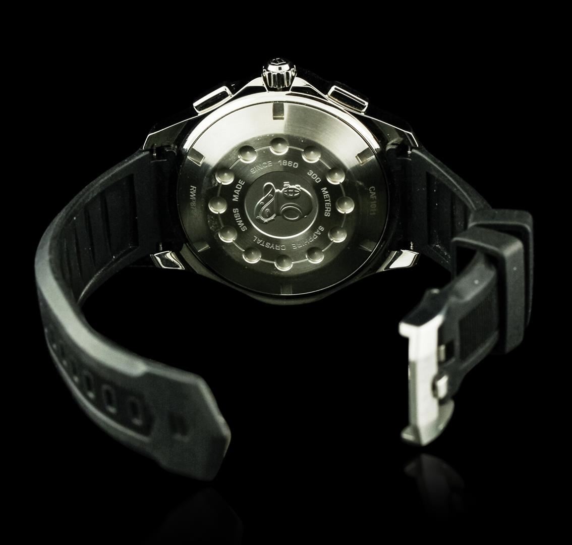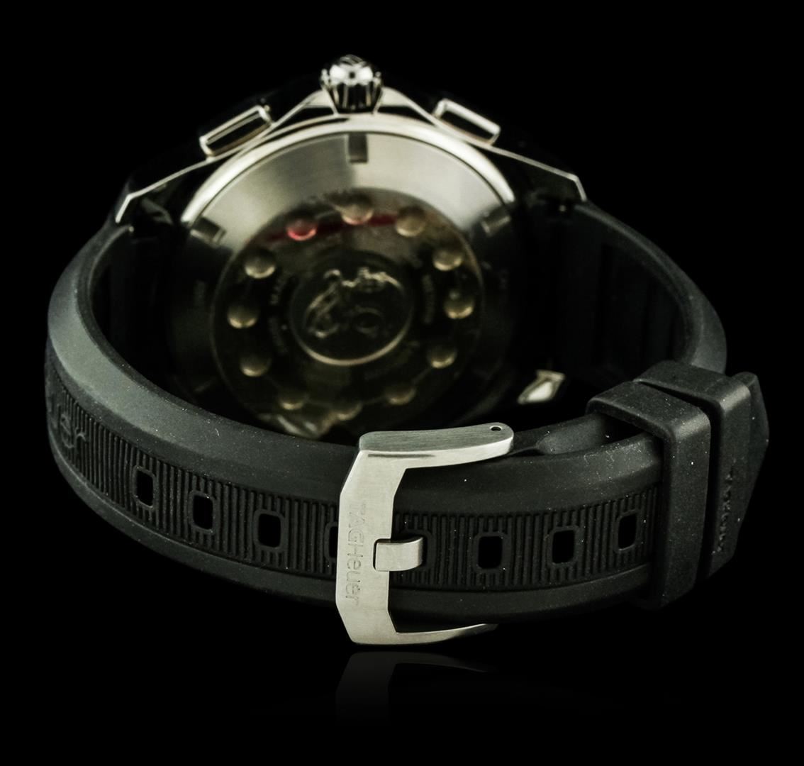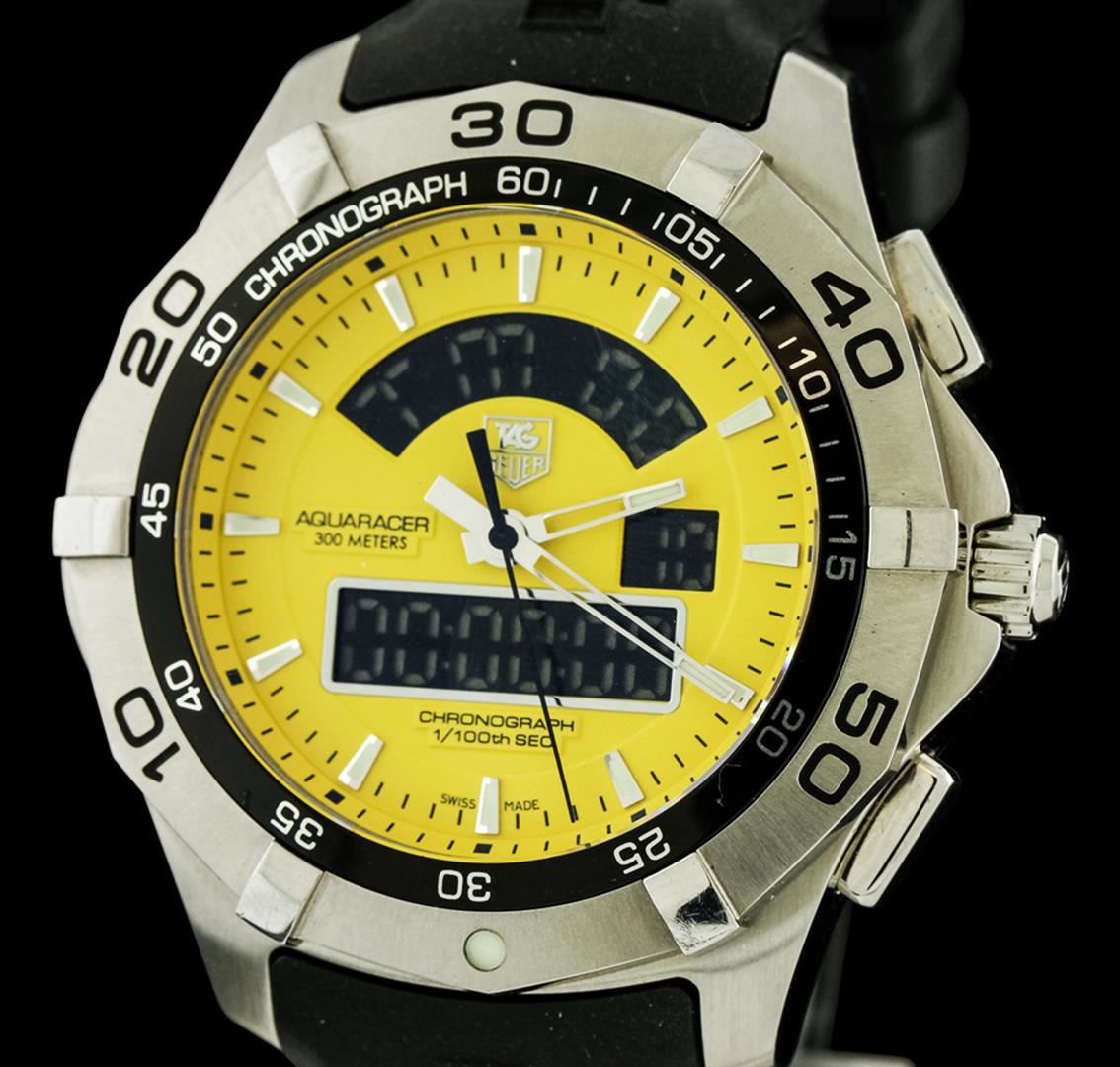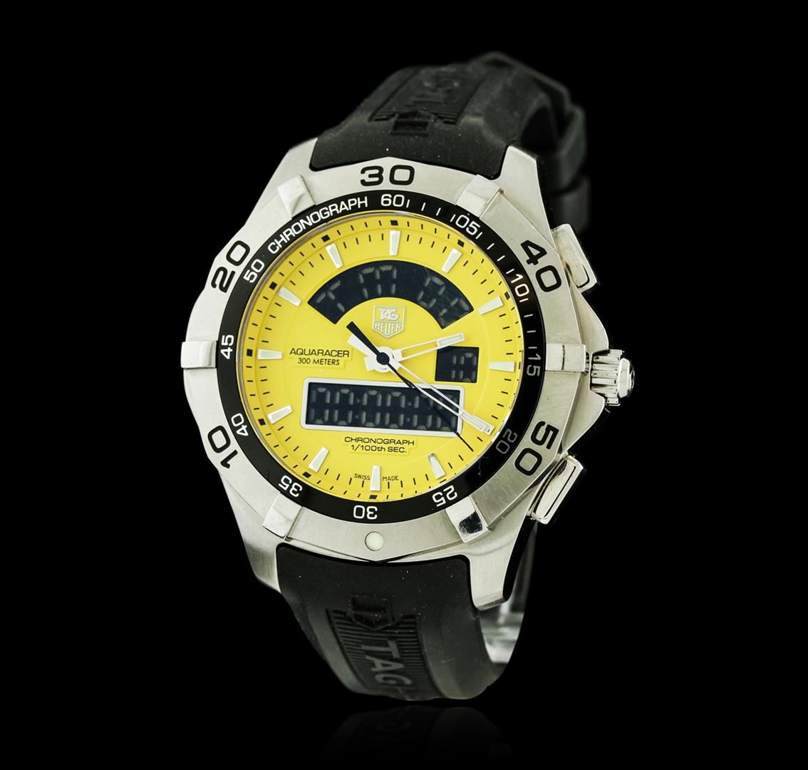 One gents Tag Heuer Aquaracer wristwatch featuring: Case: Stainless steel. Crown: Push-button polished steel crown. Bezel: Unidirectional rotating with chronograph scale, aluminum. Crystal: Sapphire, scratch resistant. Dial: Yellow. Functions: Analog hours, minutes, and seconds; digital time with back-lit dial; chronograph; alarm function; perpetual calendar; second time zone. Bracelet: Black rubber with buckle clasp. Water resistant: 300 meters; suitable for swimming, snorkeling, skin diving, and diving.